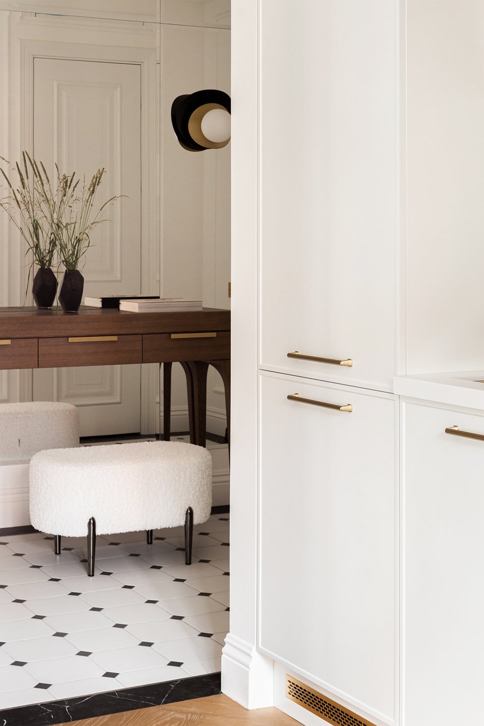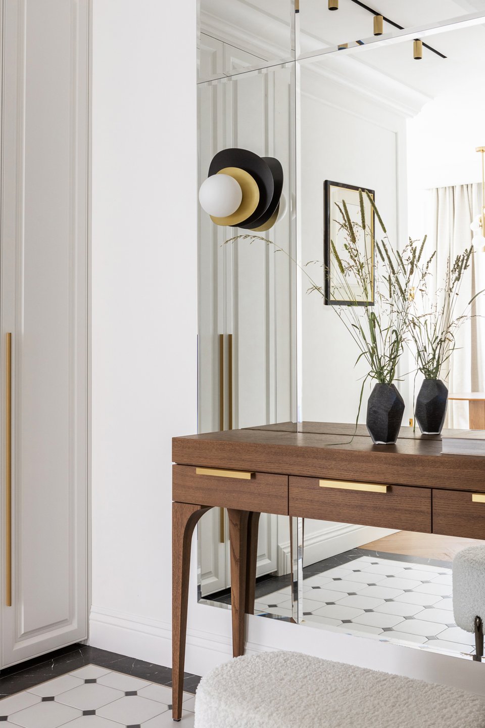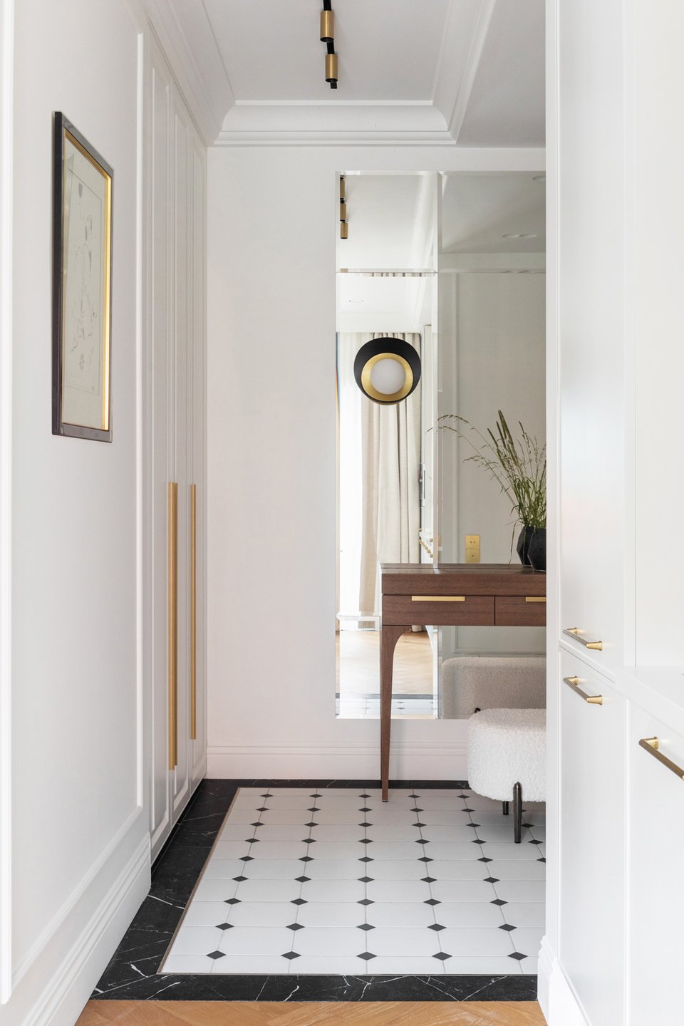 Входную зону выделили «ковром» из трех видов керамической плитки с классическим орнаментом. Отделка стен повторяет отделку в комнатах: белая краска, лаконичные молдинги. Встроенный шкаф не бросается в глаза, полностью сливаясь со стеной, акцентом служат только матовые ручки золотого цвета. Для мелочей предусмотрели консоль с выдвижными ящиками. Большое зеркало визуально расширяет пространство и делает помещение светлее.