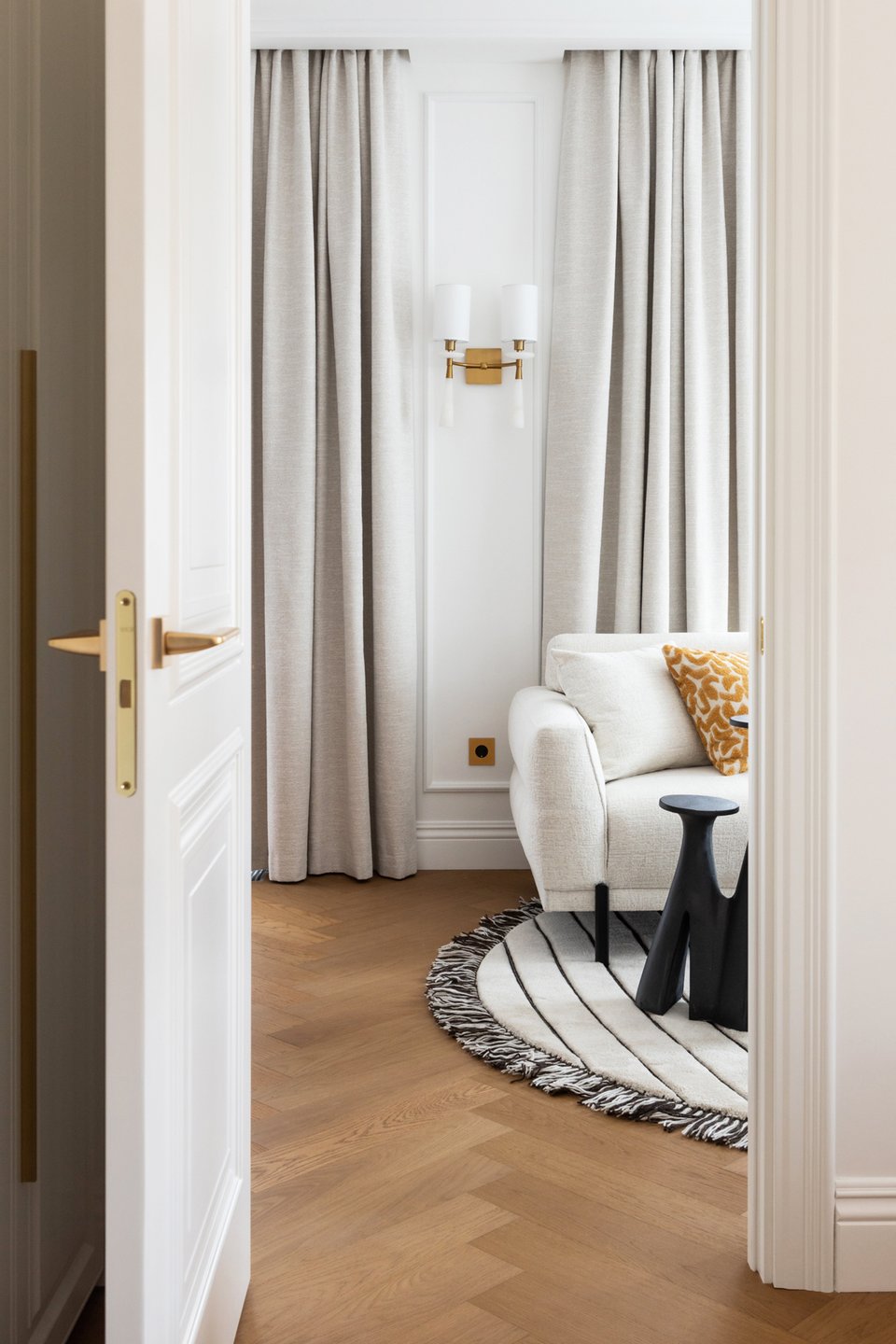 В качестве декора на стенах — строгие молдинги. Тумблерные латунные выключатели в ретростиле служат дополнительными акцентами. Они перекликаются со светильниками, золотыми ручками на дверях и мебели.