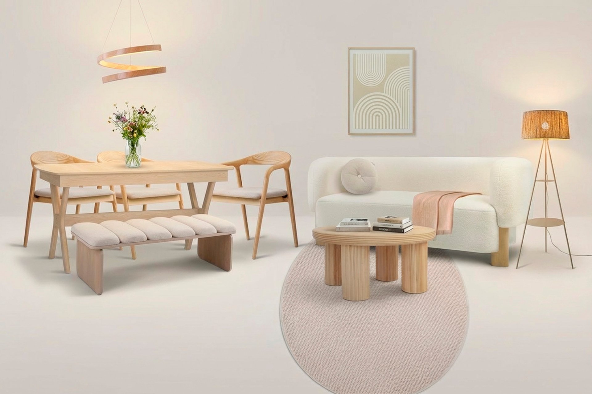 В интерьере, выполненном с оглядкой на философию джапанди, соседствуют натуральные материалы и светлая цветовая гамма, создавая умиротворяющую атмосферу. Взгляду есть за что зацепиться за счет разнообразия текстур: дерево стола и ножек банкетки органично сочетается с объемными текстильными элементами плавных форм банкетки и дивана. Ярких цветовых акцентов здесь не требуется: достаточно разных оттенков светлых тонов.