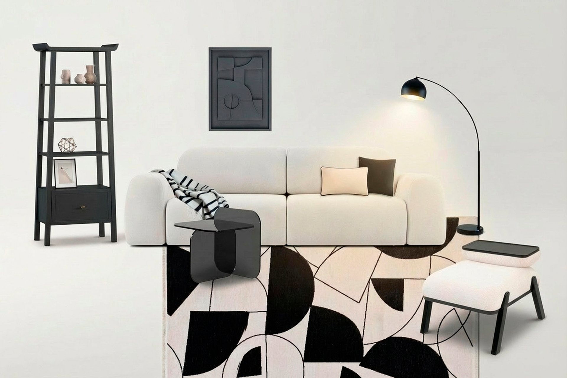 Меблировка в ахроматической гамме не обедняет визуал, а подчеркивает элегантность: достаточно — не значит мало. Контраст создается не цветами, а стилями: минималистичная банкетка с функциональным подлокотником-столиком отлично сочетается со стеллажом, словно сошедшим с изображений интерьеров японских замков. Мягкие формы дивана и концептуальный орнамент ковра дополняют общую картину.