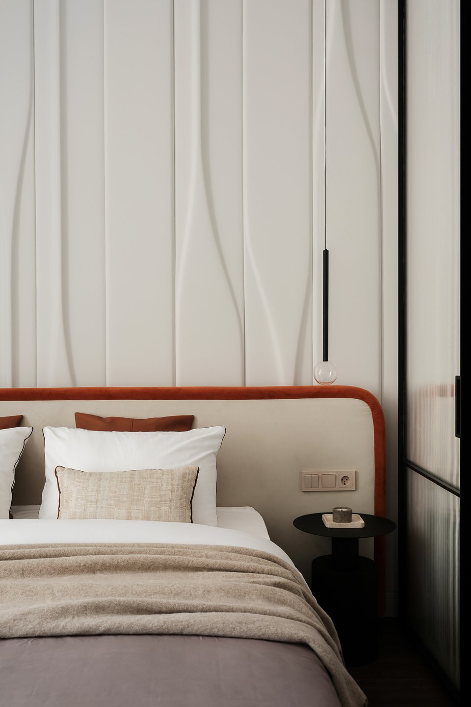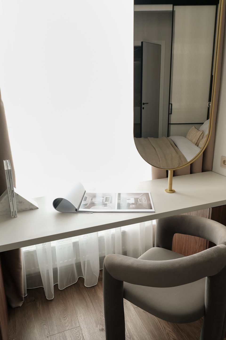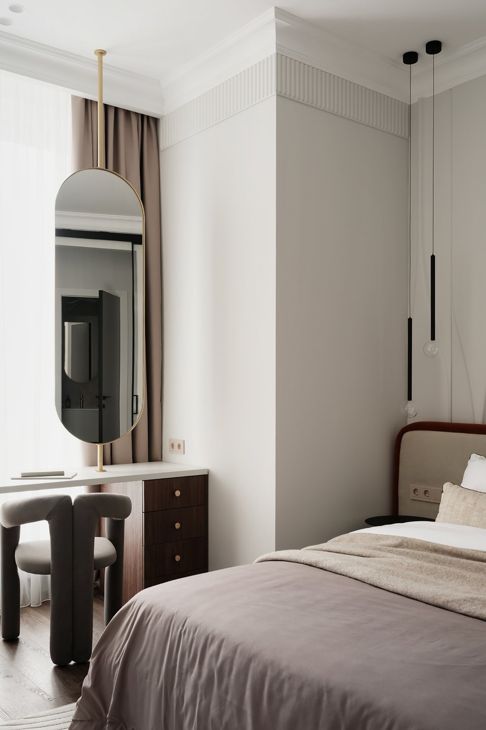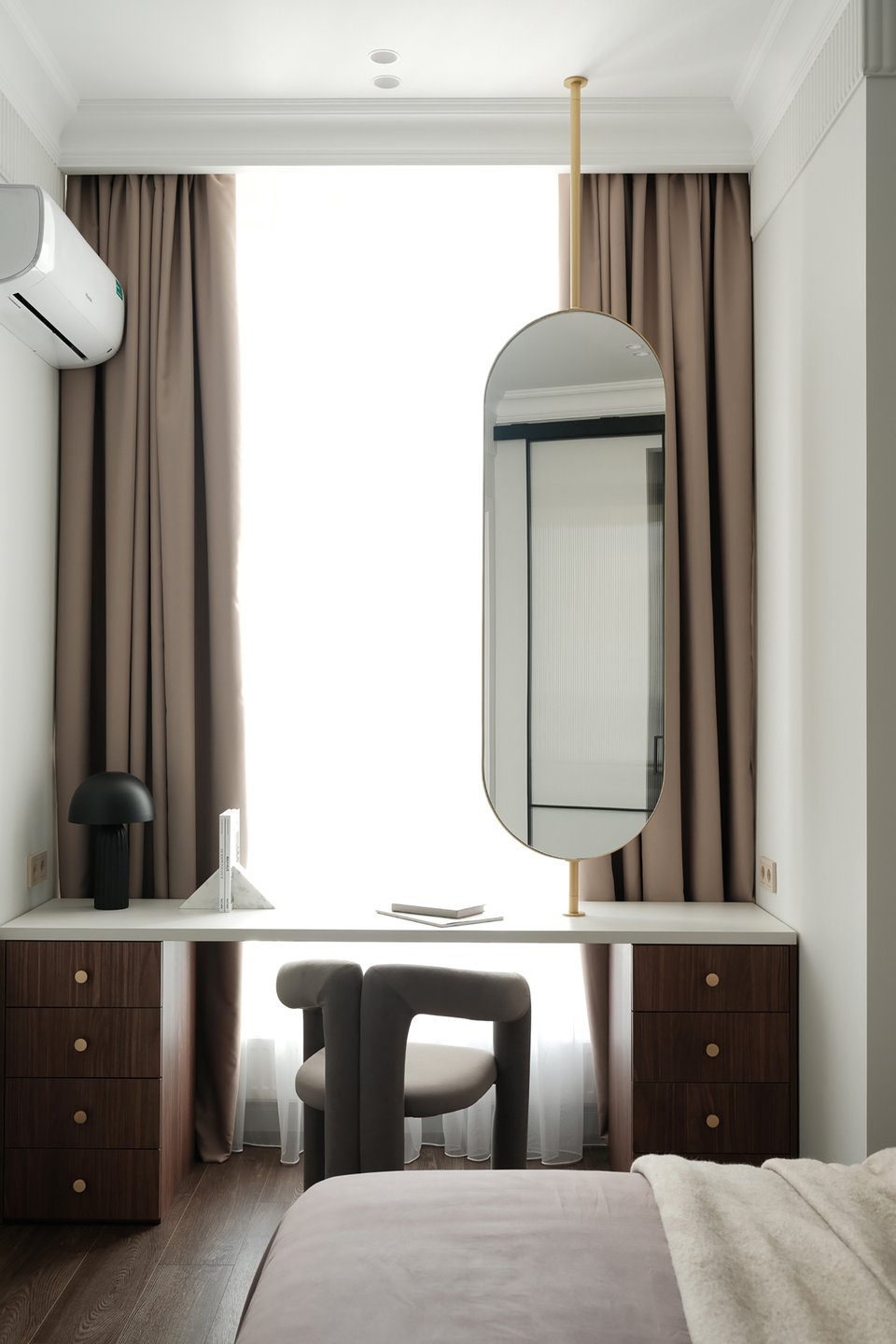 Стены в мастер-спальне окрашены в светло-бежевый оттенок. Стена за изголовьем — акцентная, с рельефными очертаниями (как на большом панно над диваном в гостиной). Кровать изготавливали под заказ: мягкое изголовье проходит по всей ширине комнаты. В качестве акцента использовали кант кирпичного цвета. Рабочая зона у окна — она же туалетный столик с зеркалом, с красивым видом.