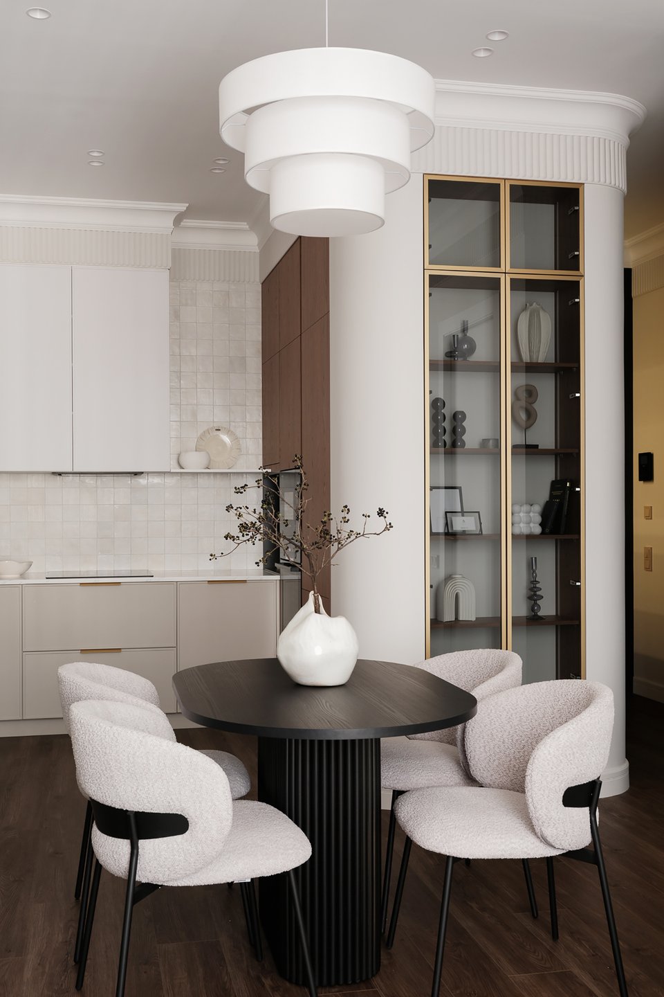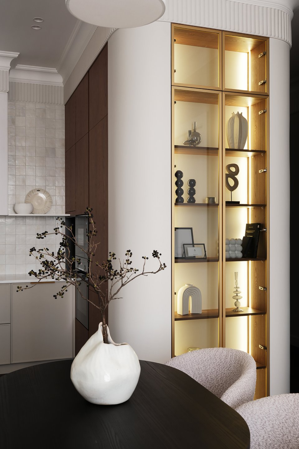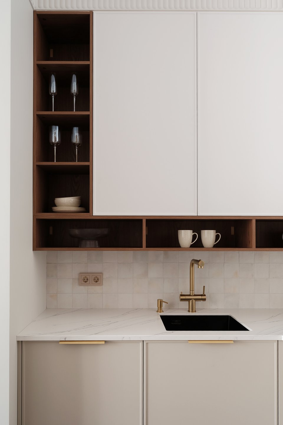 Кухонный гарнитур встроен в нишу. Столешница изготовлена из акрилового камня толщиной 20 мм, фартук выложен мелкоформатной плиткой. За витриной встроено три пенала от пола до потолка (один из них занят холодильником). На уровне столешницы предусмотрена ниша для мелкой бытовой техники.