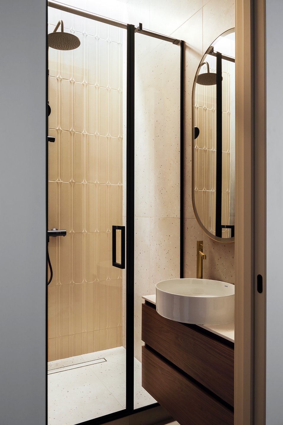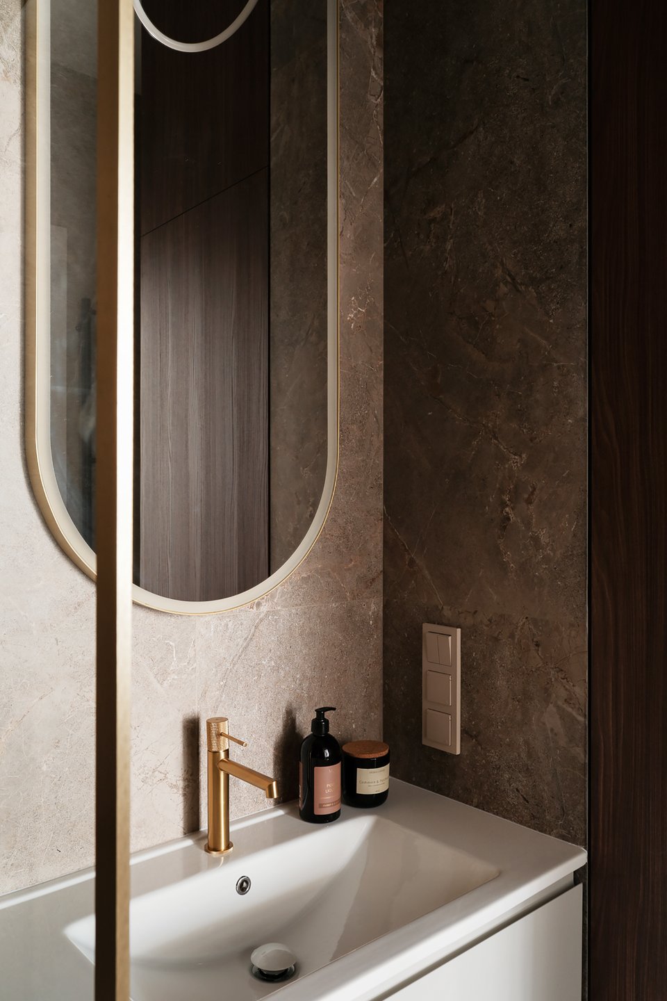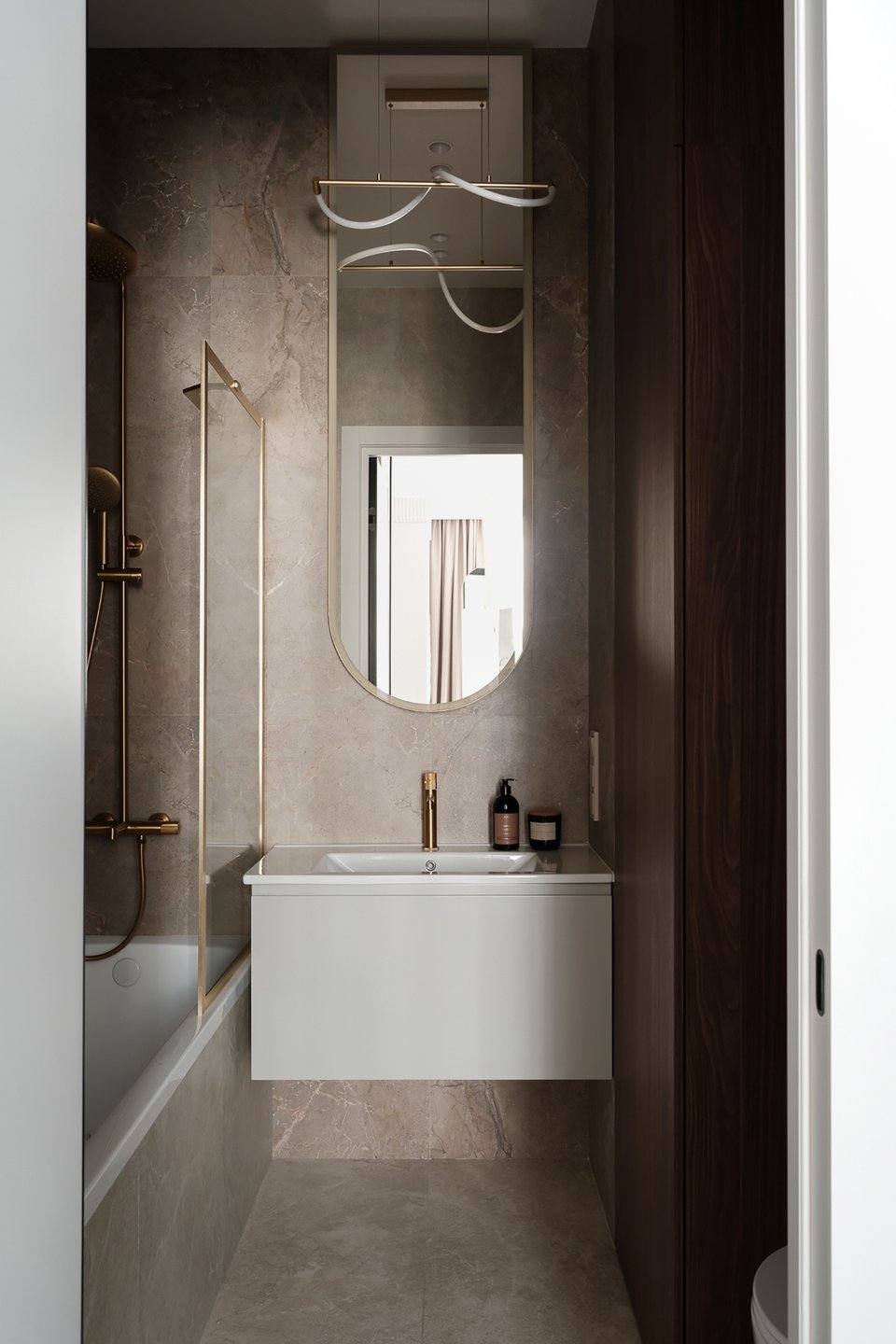«В хозяйском санузле мы повесили люстру, — комментирует дизайнер. — Она добавила не только визуальный акцент, но и красивый заливной свет для расслабляющей атмосферы».