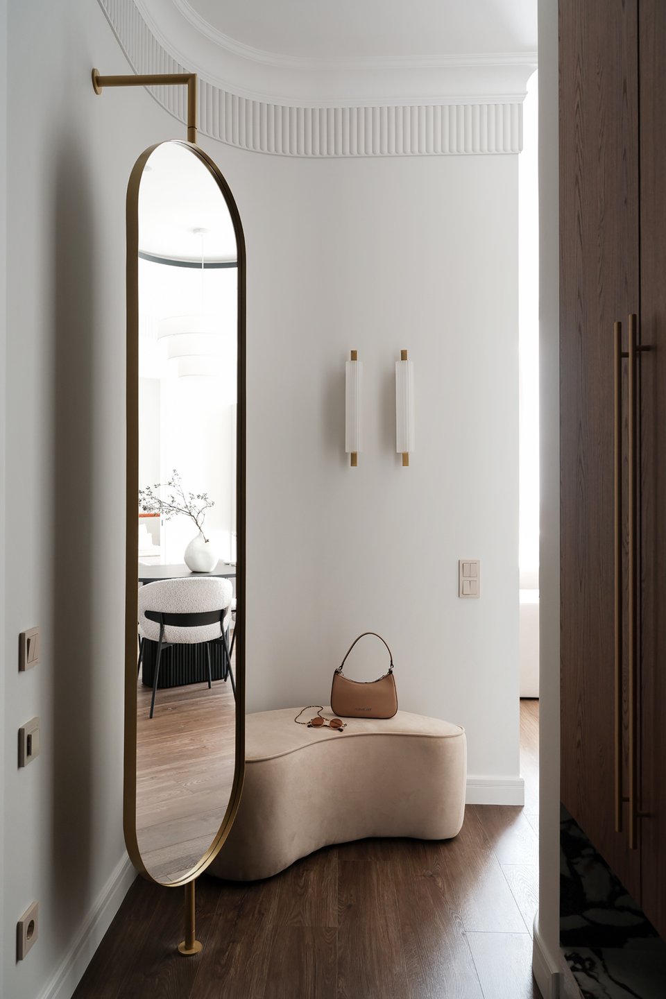 Пуф Корк от divan.ru повторил радиус нашей стены и идеально подошел по цвету. Интересная вещица, которую можно наблюдать прямо на входе. Он стоит в комбинации с высоким вращающимся зеркалом.