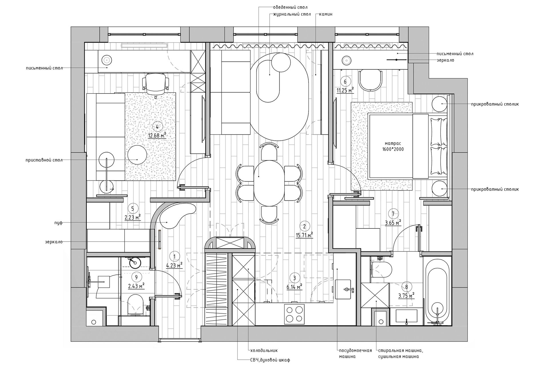 Застройщик сдавал квартиру со свободной планировкой. Кухню перенесли на место предполагаемого коридора, объединив ее с основной комнатой. «По бокам» остались мастер-спальня с гардеробной и санузлом, а также кабинет-гостевая, тоже с гардеробной. Квартира рассчитана на семью из двух или трех человек, гостевая комната может быть трансформирована в детскую.