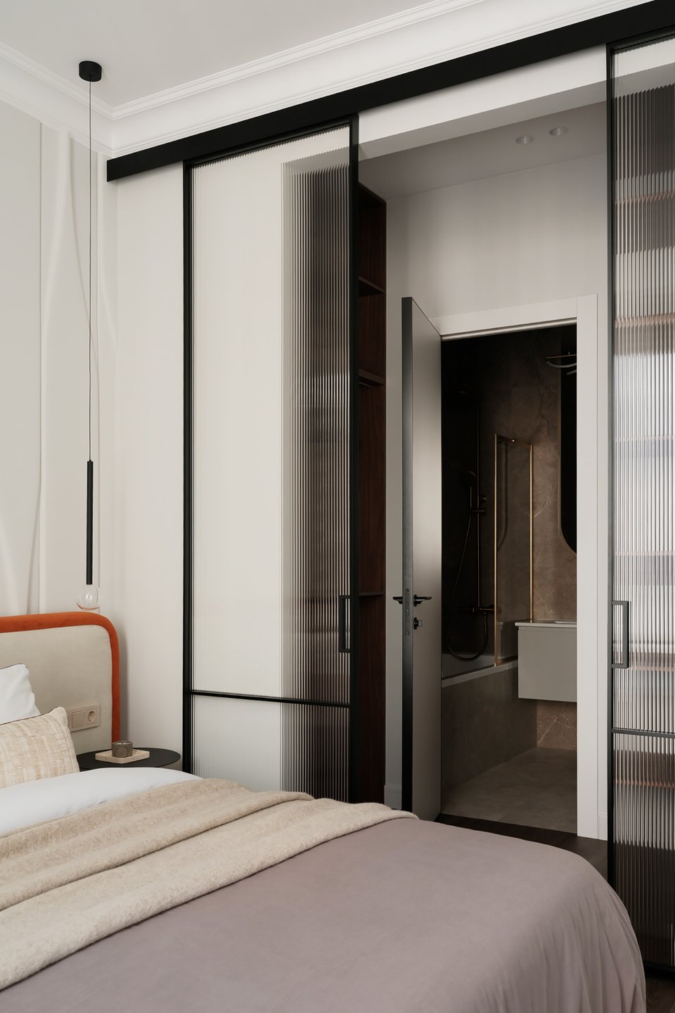Обратите внимание: за раздвижными дверями из рифленого стекла находится проходная гардеробная и мастер-санузел. В санузле установили ванну (во втором санузле — душ) и предусмотрели постирочную со стиральной и сушильной машинами, спрятанными в пенале.