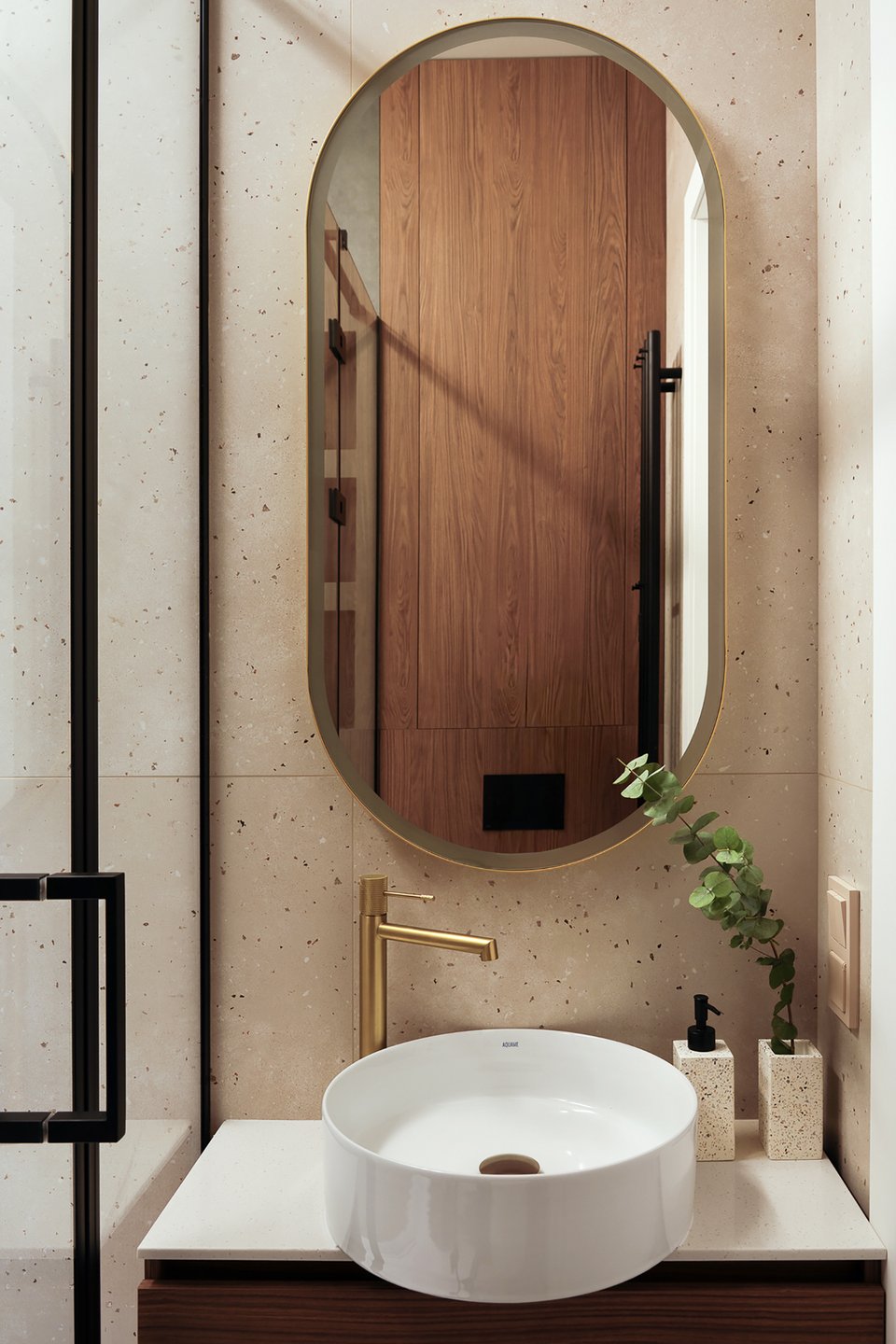 Стены в гостевом санузле выложили двумя видами плитки: крупной в стиле терраццо и мелкоформатной бежевой с рельефом. Установили подвесную тумбу с двумя выдвижными ящиками для хранения, раковину, зеркало с подсветкой, унитаз, гигиенический душ и полотенцесушитель.