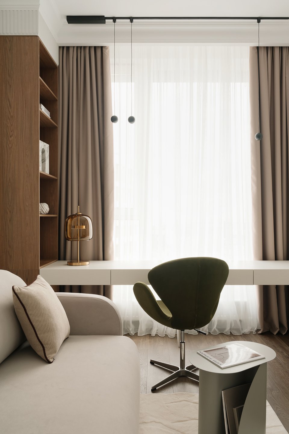 Вторая комната может в будущем превратиться в детскую, а сейчас она выполняет функции кабинета и гостевой спальни. Рабочее место — широкая столешница, которую установили между двумя стеллажами для книг и декора. Композицию дополняет компьютерное кресло, а также подвесная лампа с треком на потолке.