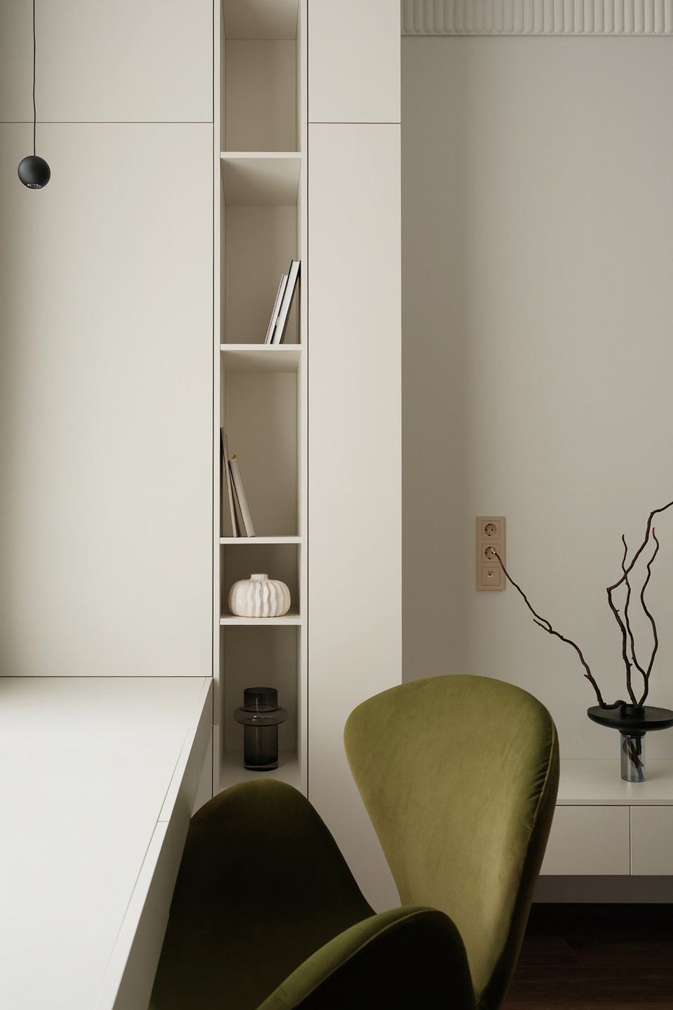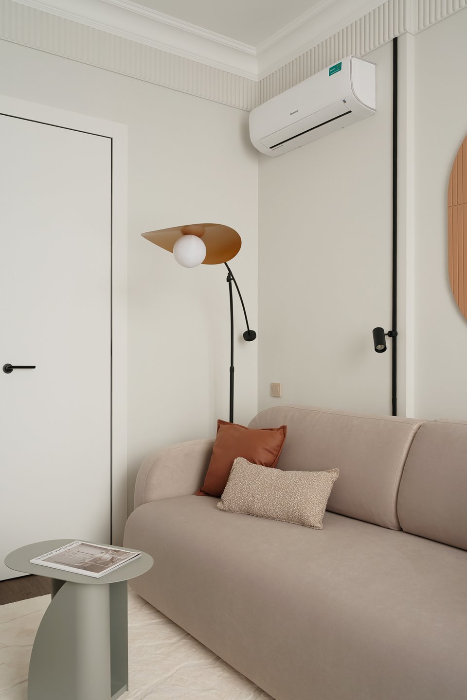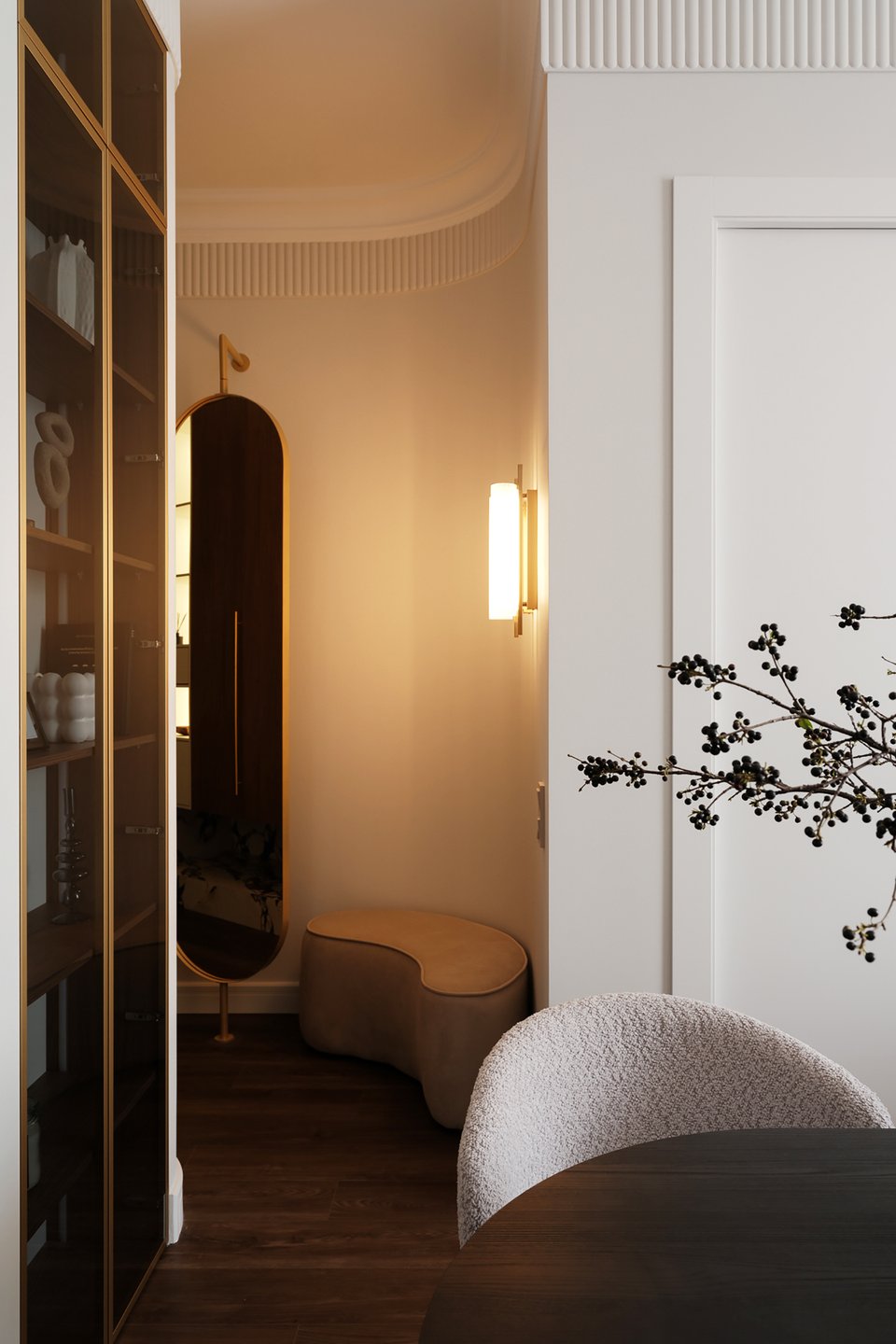 «В квартире преобладают светлые оттенки, прежде всего из-за своей универсальности, — рассказывает дизайнер. — Таким решением воспользовались, чтобы интерьер нравился большинству потенциальных покупателей. Вторая причина — постоянно серая Москва: хотелось сделать пространство светлым и обволакивающим».
