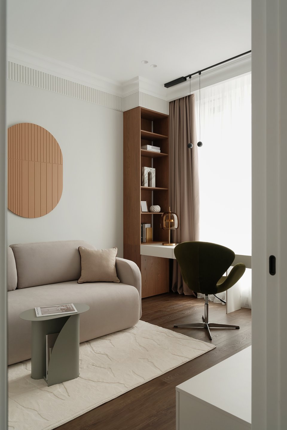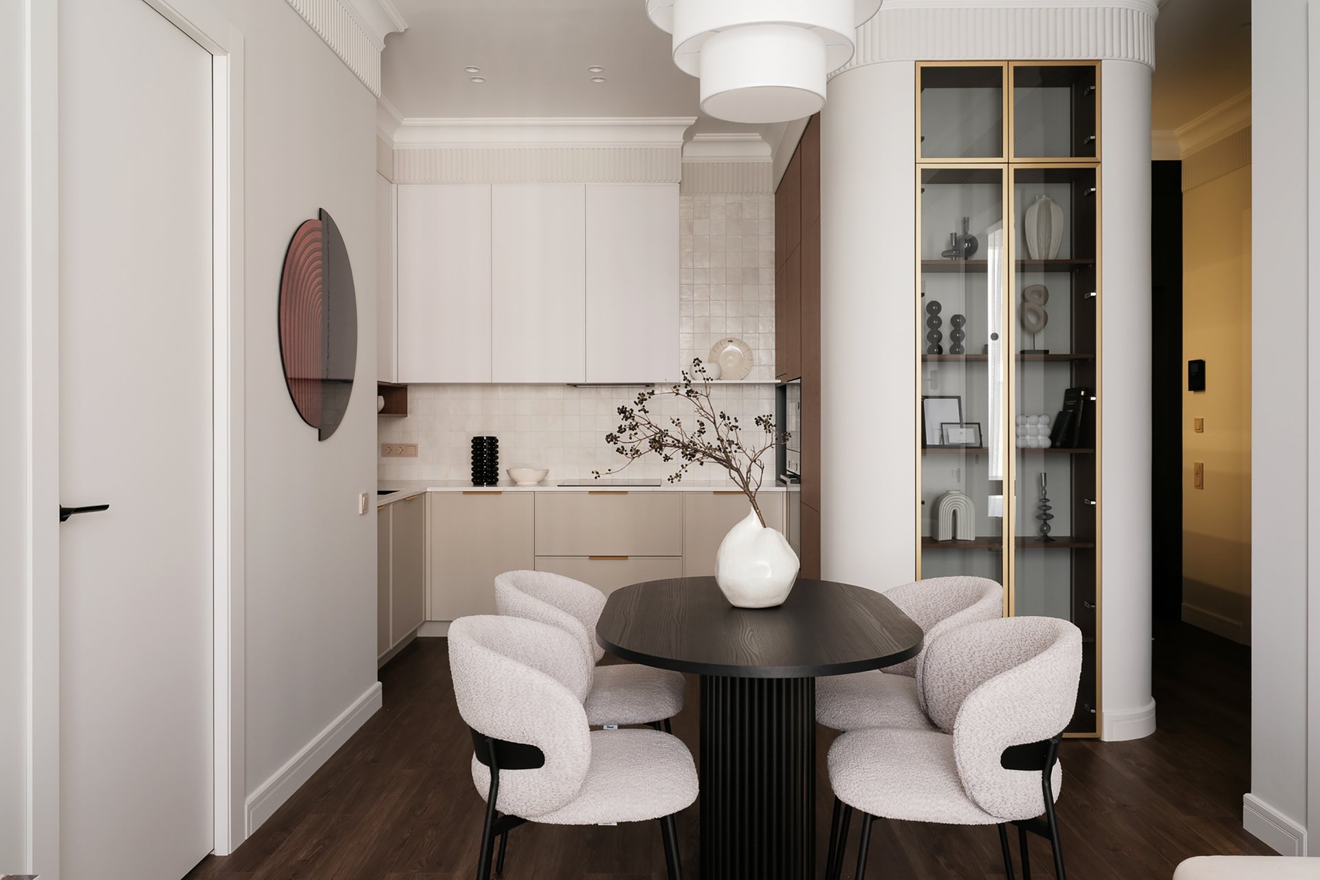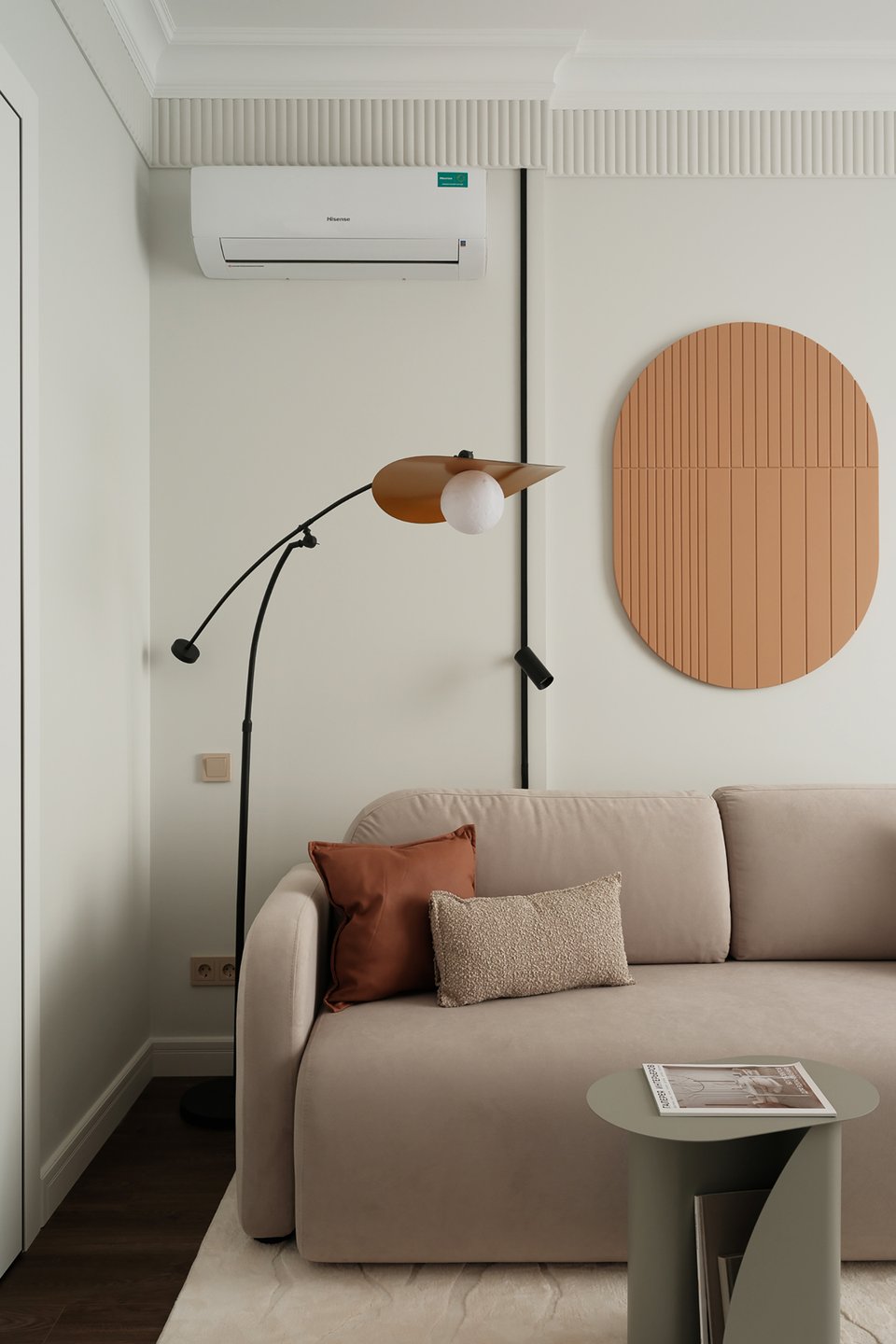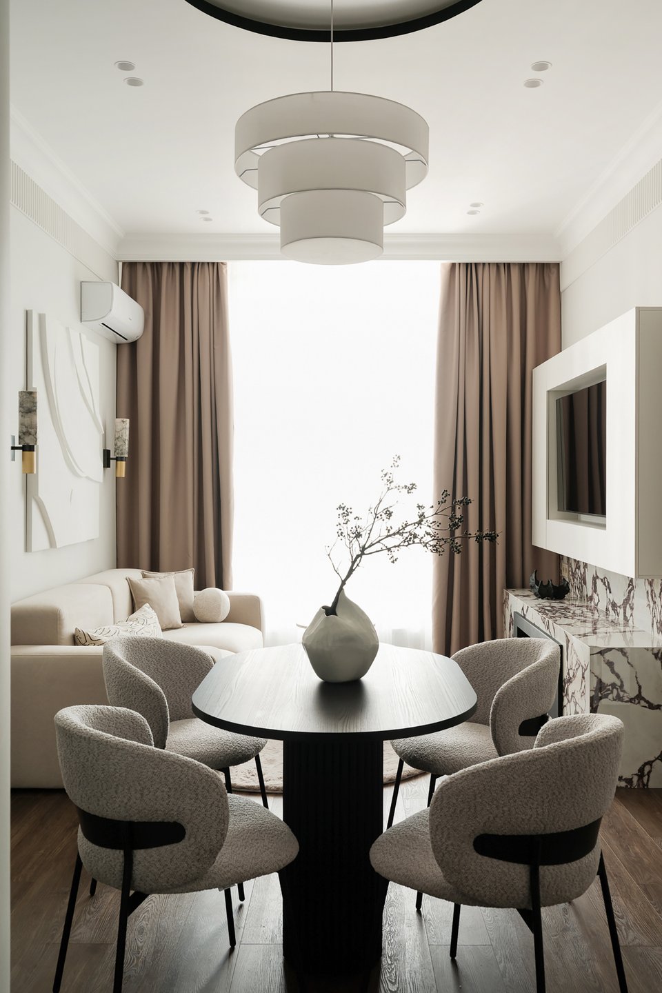 «В квартире преобладают светлые оттенки, прежде всего из-за своей универсальности, — рассказывает дизайнер. — Таким решением воспользовались, чтобы интерьер нравился большинству потенциальных покупателей. Вторая причина — постоянно серая Москва: хотелось сделать пространство светлым и обволакивающим».