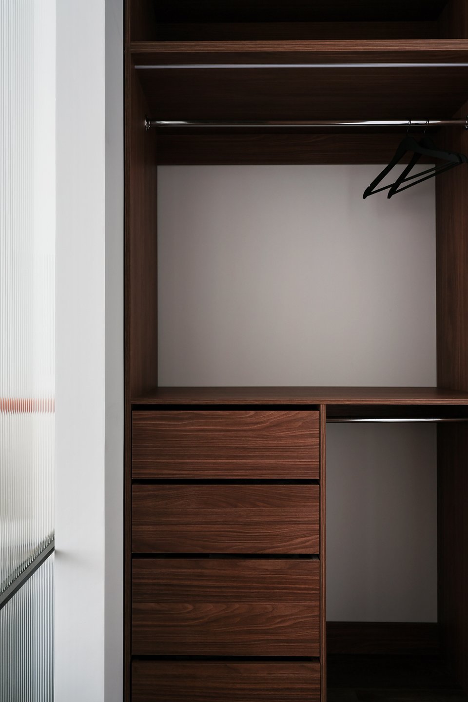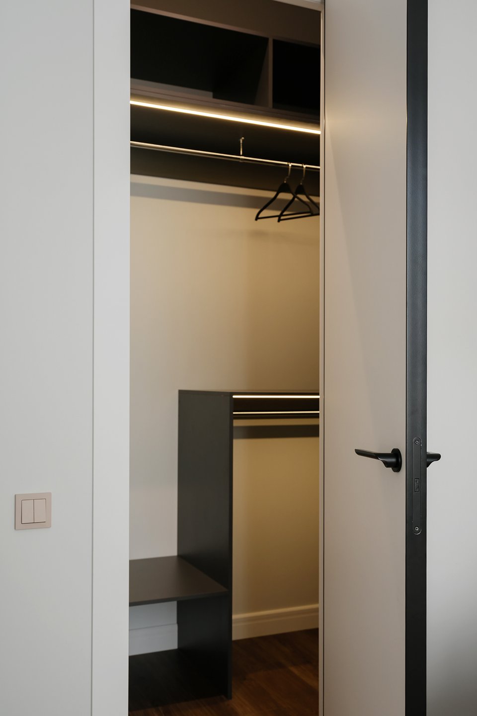На входе в квартиру спроектировали шкаф, в котором выделено место и под бытовое хранение, и под хранение уличной одежды. Также есть пара выдвижных ящиков, где можно хранить ключи и аксессуары.