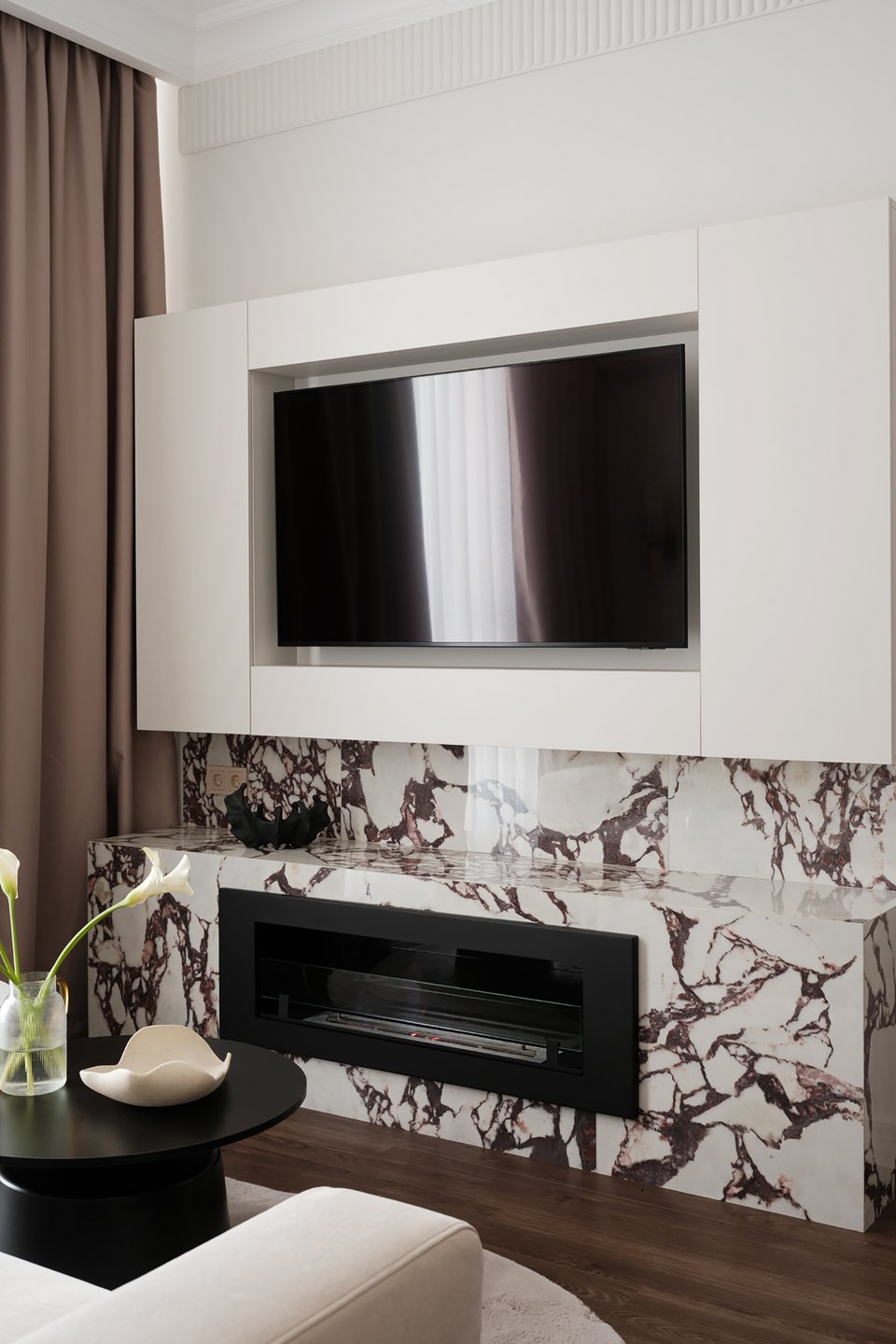 Камин в зоне гостиной — в строительном исполнении: в ходе ремонта собрали короб из гипсокартона, а затем облицевали его глянцевым керамогранитом. В нишу встроили биокамин, который работает на жидком топливе. Над ним — подвесная «стенка» под ТВ, где вокруг экрана организовано хранение: за фасадами спрятаны полки для мелочей.