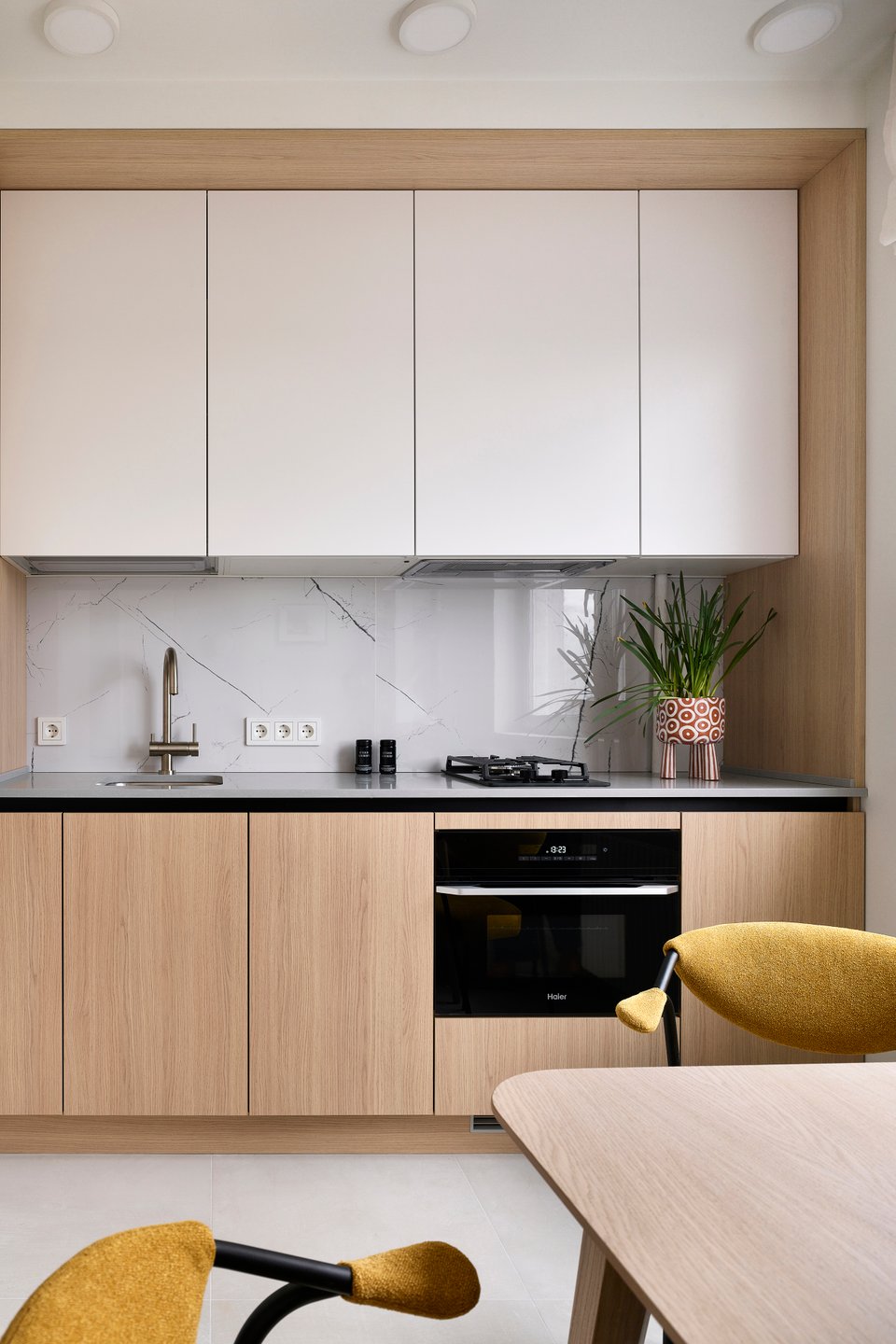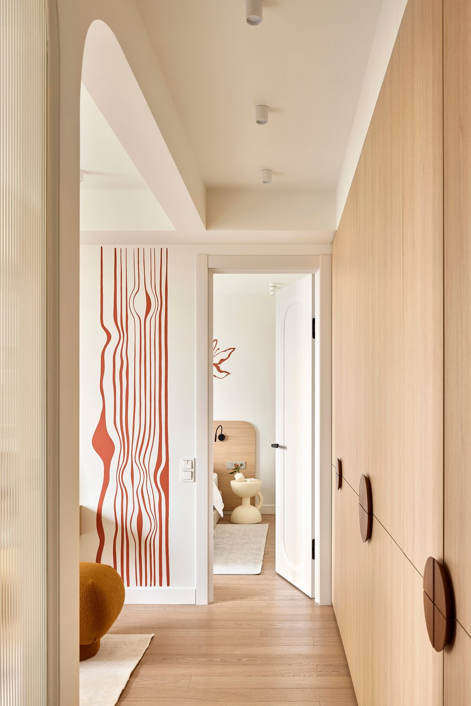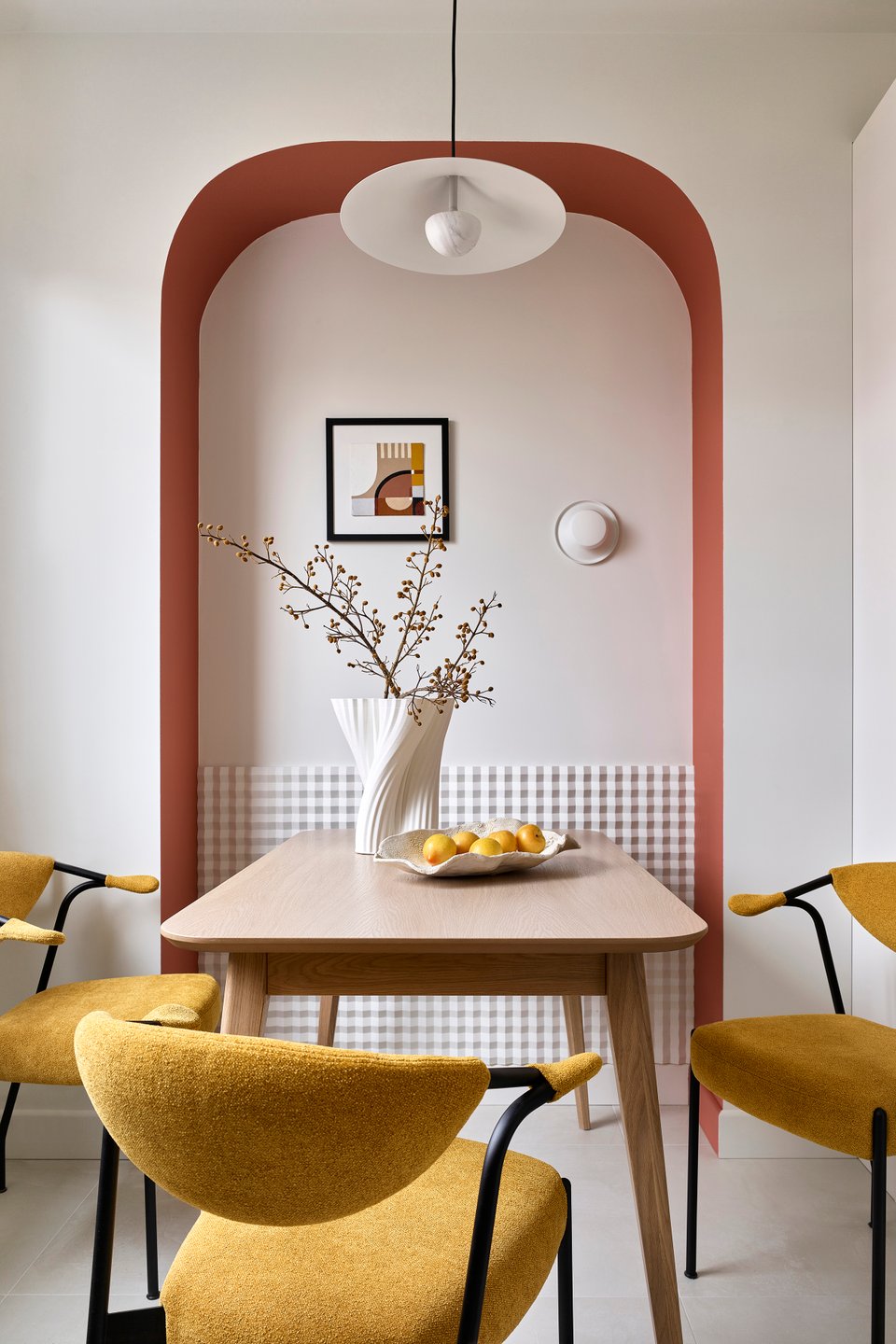 Площадь кухни — 7,6 кв.м, поэтому здесь использовали узкую посудомоечную машину, мини-варочную панель и компактный духовой шкаф. При входе пришлось работать со сложной конструктивной нишей: чтобы сделать пространство гармоничнее, дизайнер добавила симметрии и превратила нишу в декоративную арку. Торец покрасили в терракотовый цвет, что добавило интерьеру глубины и связало кухню с художественной росписью в других комнатах.