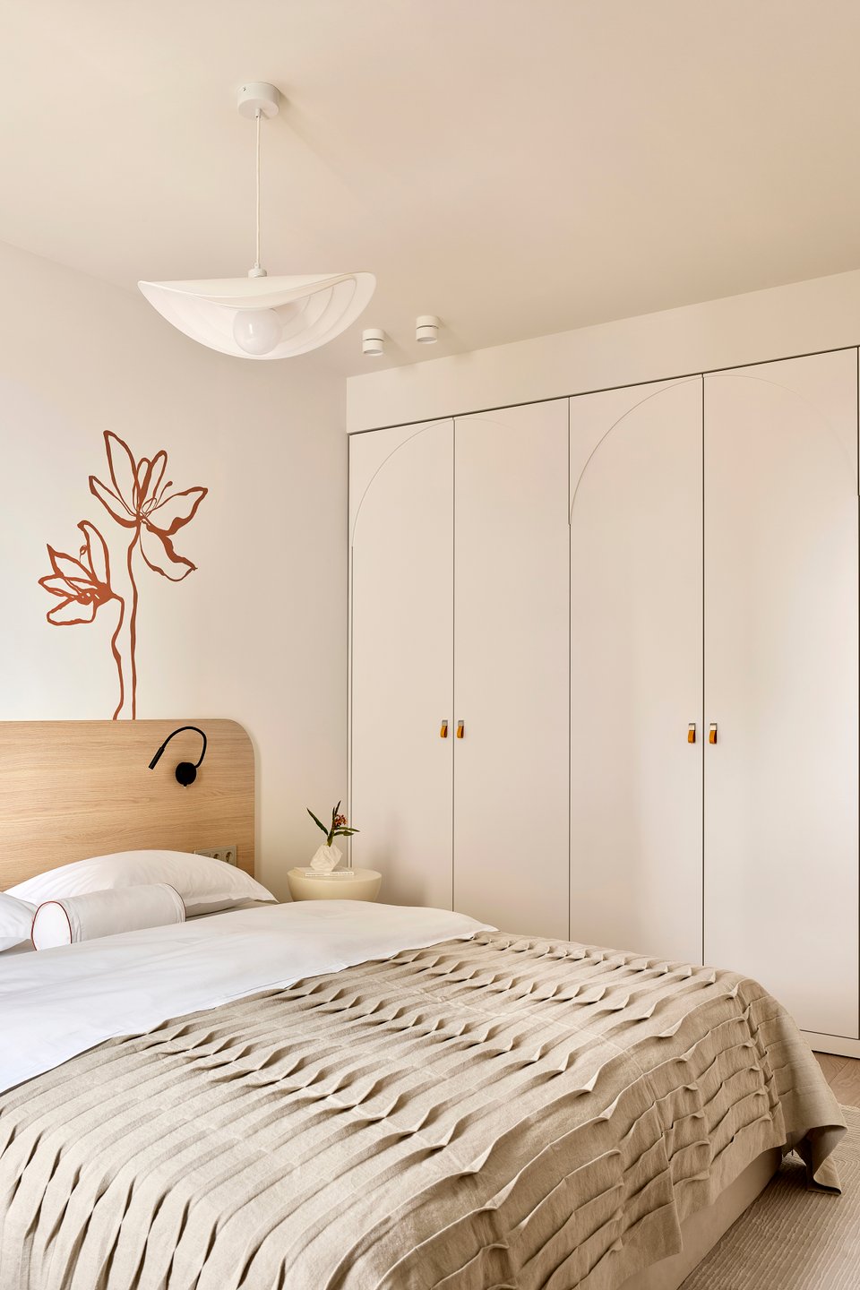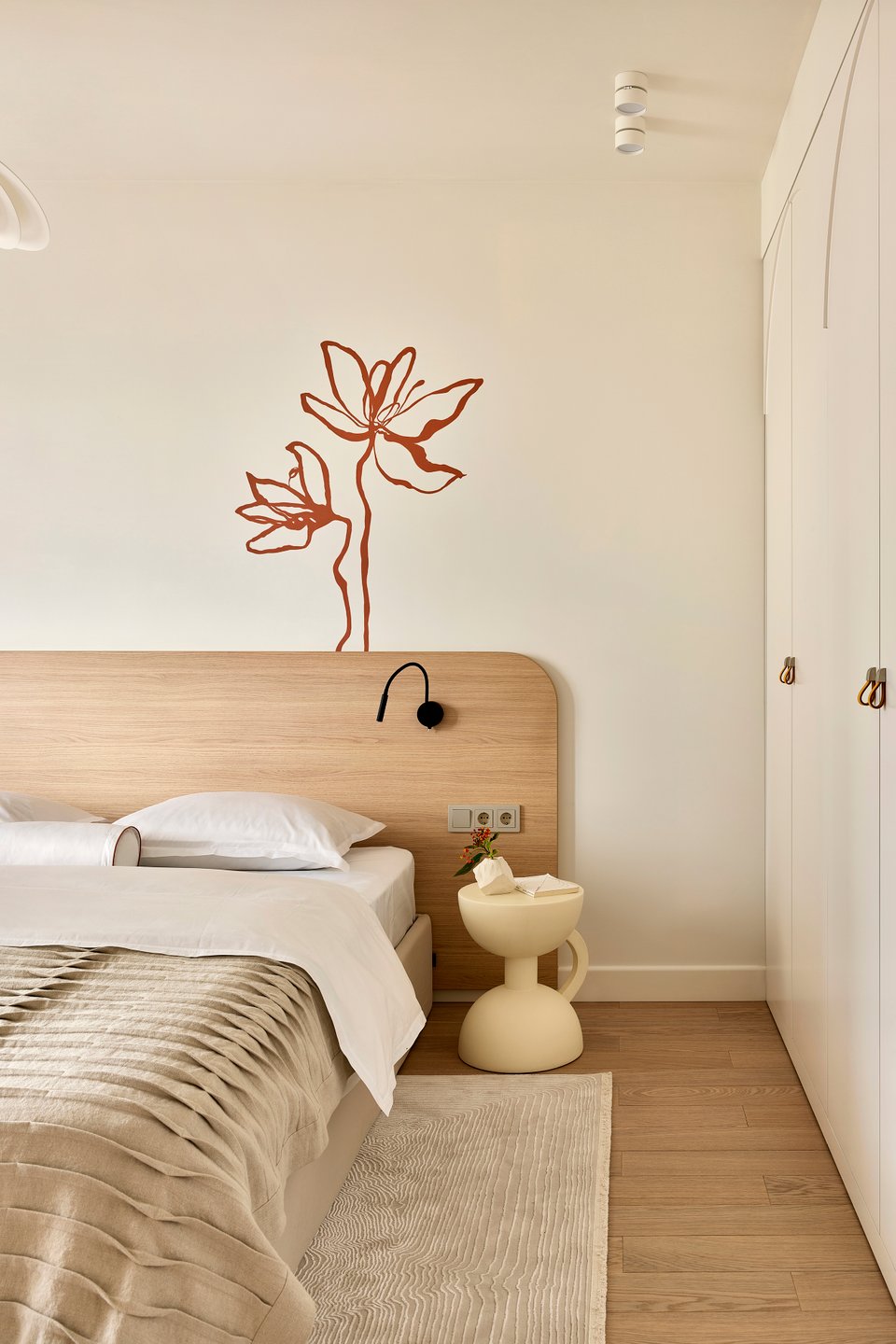 «Над изголовьем художники выполнили флористическую роспись в терракотовых оттенках. Она добавляет интерьеру индивидуальности и становится главным декоративным элементом комнаты».