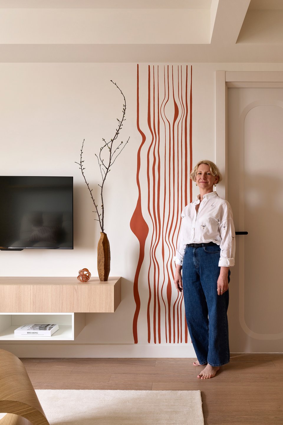 «Главная работа велась с архитектурой помещения, — рассказывает дизайнер. — Мы не делали перепланировку, лишь аккуратно адаптировали ее под запрос владелицы. Несущие балки зашили и скруглили, превратив их в выразительные элементы интерьера. На кухне пилон и нишу оформили в виде декоративной арки. В гостиной геометрия балок помогла создать интересное зонирование».