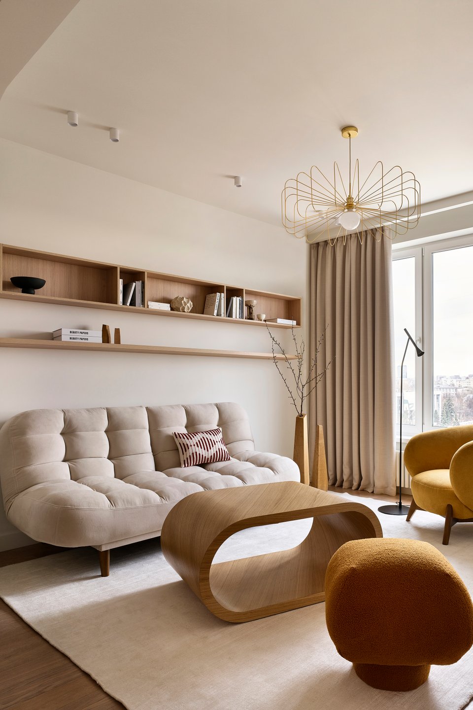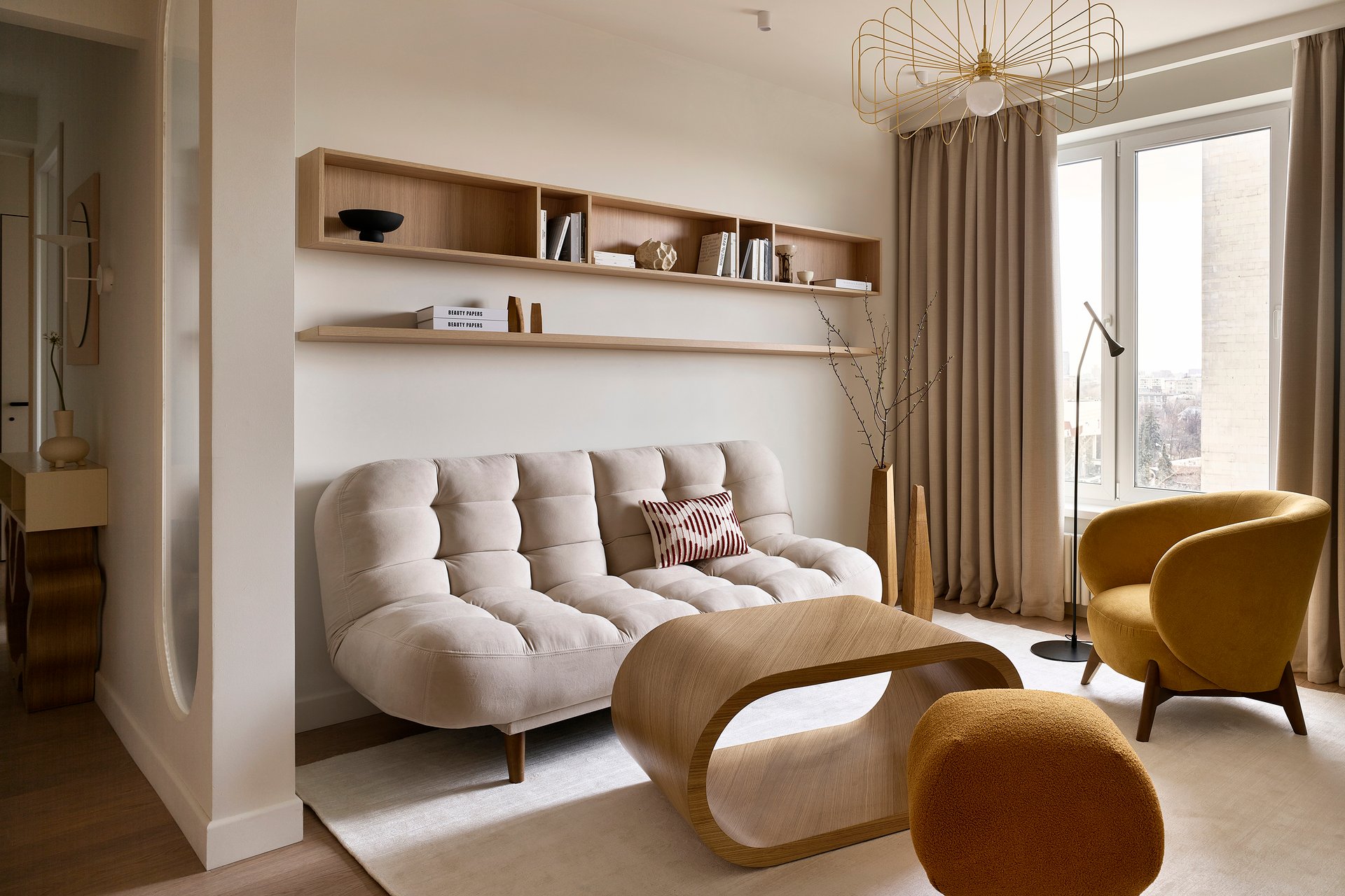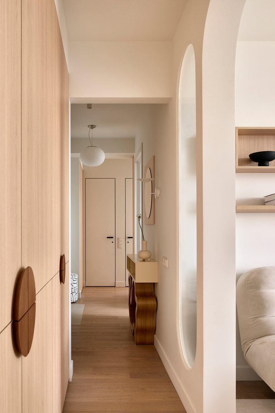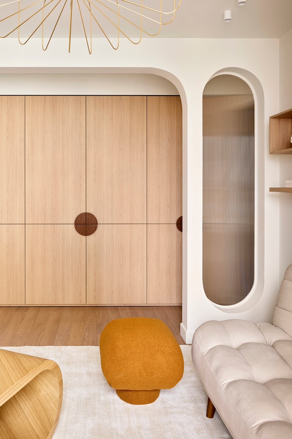Центральную комнату в квартире разделили на две части: проходную (у шкафа) и основную (лаунж-зону). Границей между ними стала овальная перегородка со стеклом-плиссе. Она пропускает свет, но при этом создает ощущение камерности.