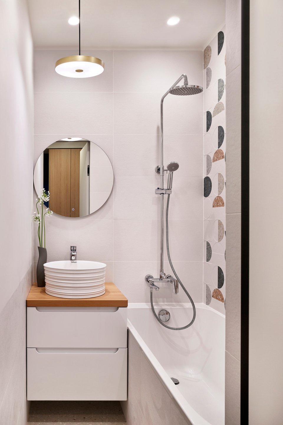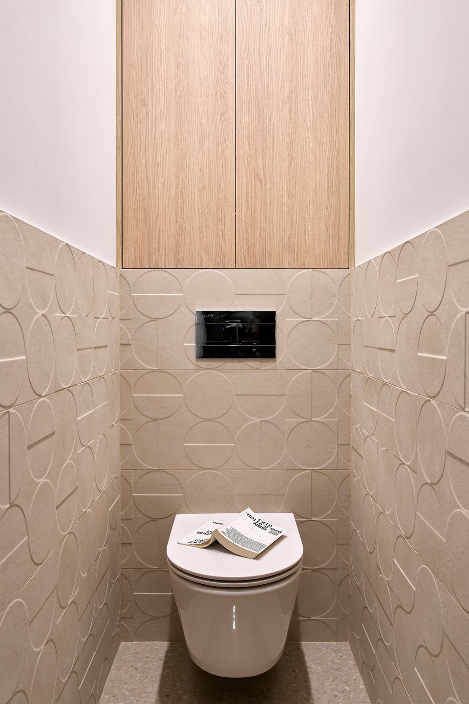 Оба помещения довольно компактные (2,17 и 1,29 кв.м). Светлая плитка с современным графичным рисунком делает пространство визуально более просторным и свежим.