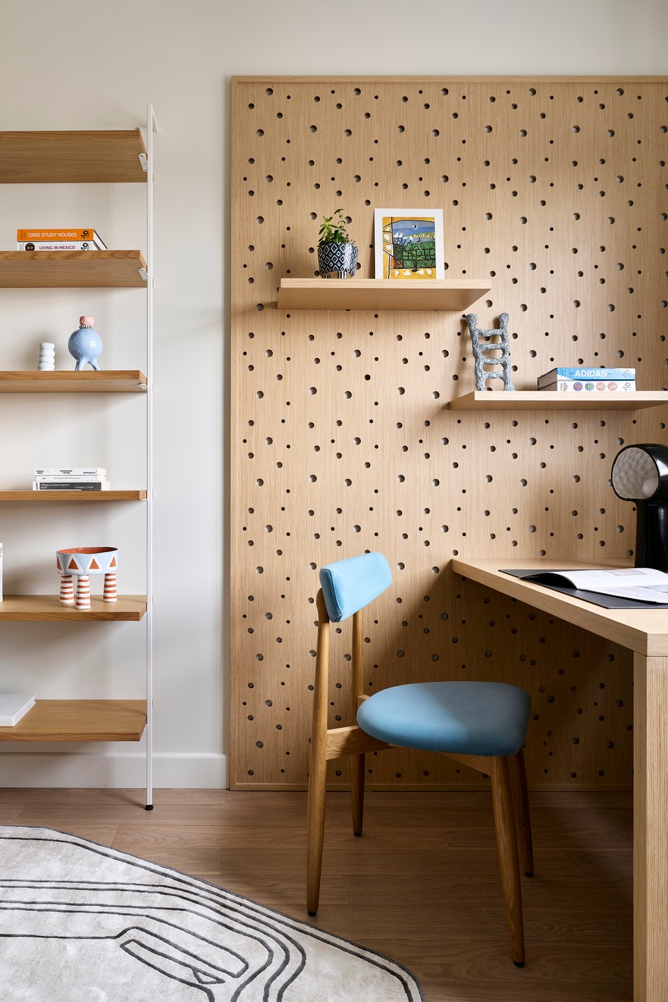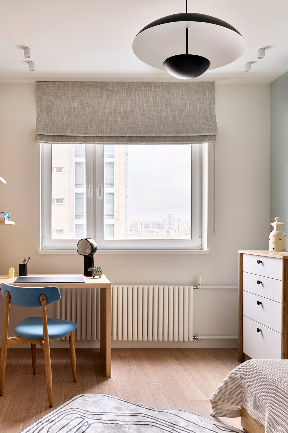 Детская комната оформлена в светлой и спокойной гамме. Рядом с кроватью поставили небольшой пуф Кропс от бренда divan.ru: на него удобно положить одежду перед сном или использовать как прикроватную тумбу для книг. В качестве декоративного элемента дизайнер предложила шпонированную панель с рандомной перфорацией.