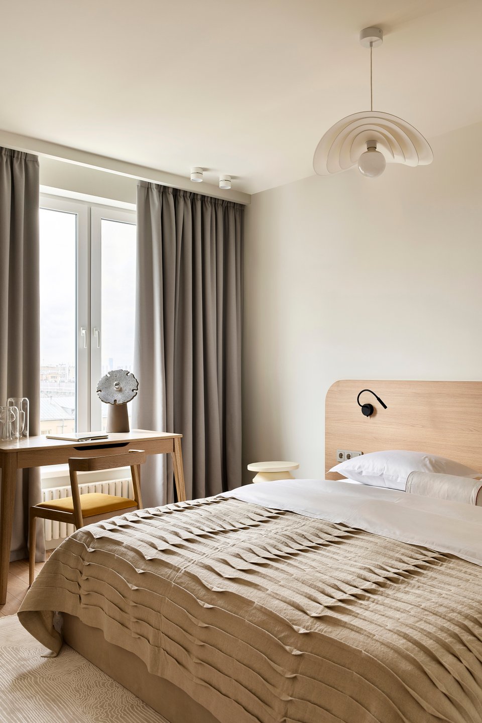 Спальня получилась спокойной и камерной. Кровать выбрали максимально лаконичную, а изголовье изготовили из шпонированного МДФ со скругленными краями. У окна с панорамным видом расположили рабочее место.