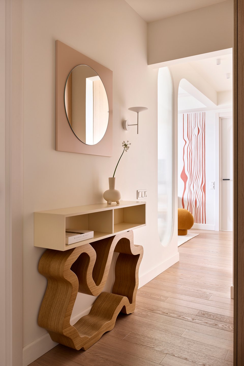 В прихожей спроектировали большой встроенный шкаф для вещей и технический шкаф со стиральной машиной. Главным украшением пространства стала консоль с основанием из корня дерева.