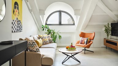 «У хозяйки квартиры добрый характер и нежная натура, — рассказывает дизайнер. — Поэтому в спальне я предложила использовать обои с милым принтом. Вместе мы выбрали рисунок с птицами на тонких ветках. На голубом фоне еще выгоднее смотрится необычное изголовье кровати Лиель от divan.ru».