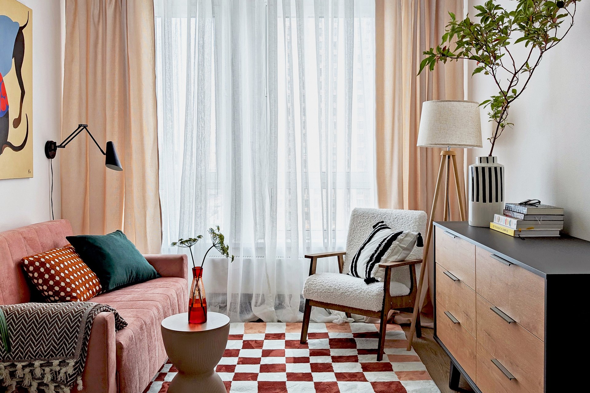 Зону гостиной «объединяет» большой плюшевый ковер. Обстановку дополнили небольшим удобным креслом в ретростиле и кофейным столиком, который можно переносить к дивану или креслу в зависимости от способа времяпрепровождения. Кроме подвесных светильников, в помещении есть несколько источников освещения на уровне глаз (бра, торшер) для создания приятной атмосферы вечером.