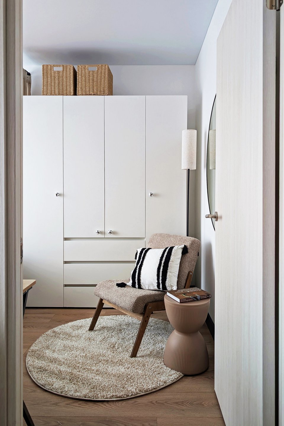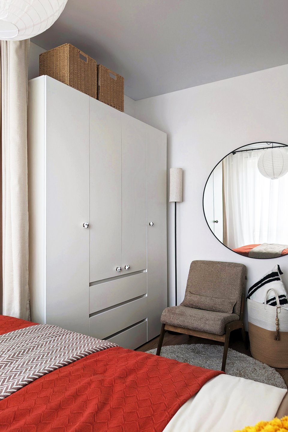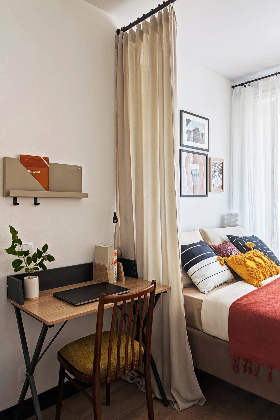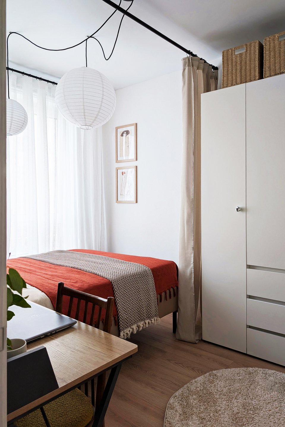 Отделку стен в спальне оставили от застройщика. В помещении выделили зоны для сна и работы, разделив их текстильной шторой. Для основного хранения установили готовый, отдельно стоящий шкаф.