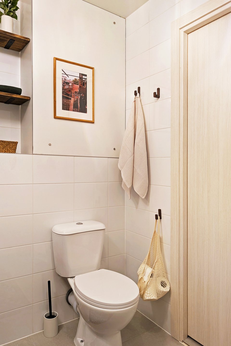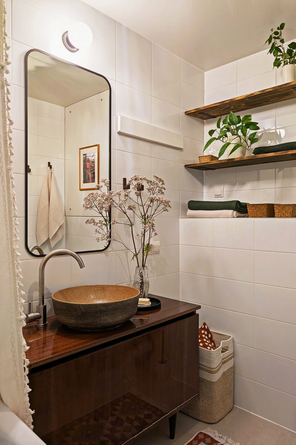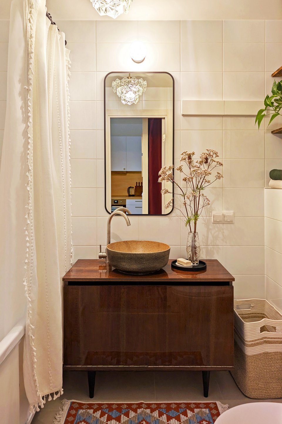 «Скучная серая плитка в санузле — один из минусов отделки от застройщика, — делится дизайнер. — Но ее удалось грамотно обыграть и достичь уюта и тепла. Винтажная тумба под раковину не только интересно смотрится, но и намного выгоднее, чем новая. Взяли старый бельевой шкаф и установили на него отдельно стоящую раковину. Тумба добавила визуального тепла серому помещению, а текстиль с бахромой поддержал тумбу. Для дополнительного хранения есть полки в нише».