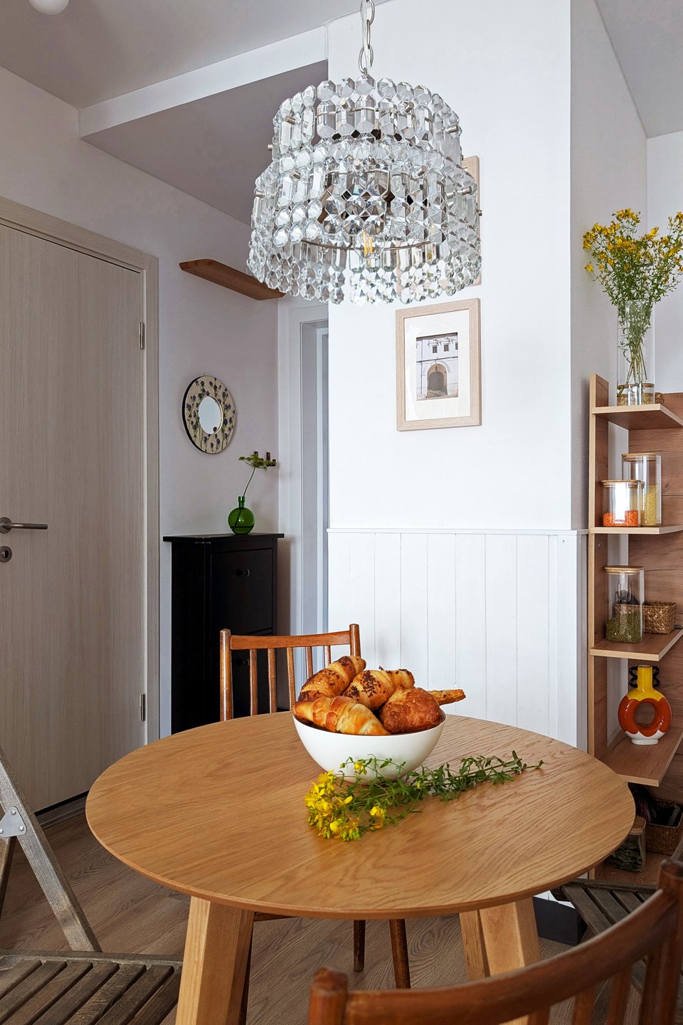 Кухонный гарнитур собрали из готовых модулей. Самая большая система хранения находится в крайнем шкафу кухни. Кажется, что там два холодильника, но это не так: слева холодильник, а справа — шкаф. Круглый стол в столовой зоне дополнили винтажными стульями в травянисто-лимонной обивке. Заказчик привез эти стулья с дачи: там они не использовались, а здесь получили новую жизнь. Несмотря на выведенные от застройщика точки для света, люстру сместили к обеденной зоне, удлинив провод и подвесив ее на крючок.