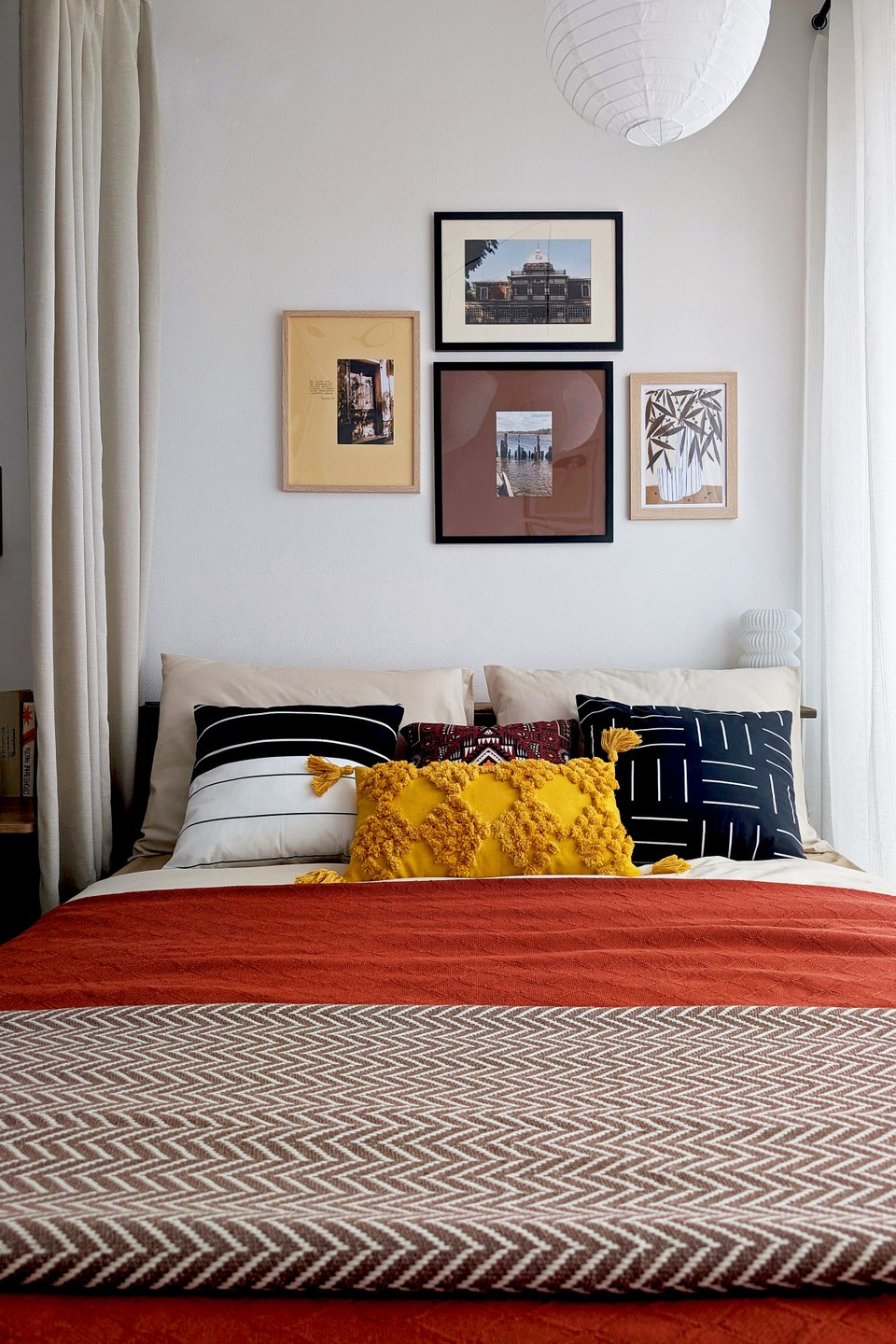 В помещении застройщиком был предусмотрен только один вывод под свет на потолке, и он попадал ровно между спальной и рабочей зоной. Посредством открытой проводки весь свет перенесли к кровати, оформив его объемными бумажными шарами. В рабочей зоне установили напольный торшер и повесили бра-прищепку.