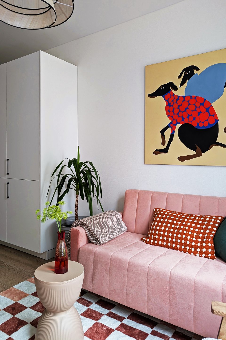 Диван Маре Мини от divan.ru играет ключевую роль в зоне гостиной. Коралловый оттенок его обивки просто невероятный. Диван приехал в квартиру первым, и заказчики сначала испугались такого розового «пятна» в пустой белой квартире. Но когда интерьер был закончен, мы выслушали массу комплиментов и восторженных отзывов о его цвете.