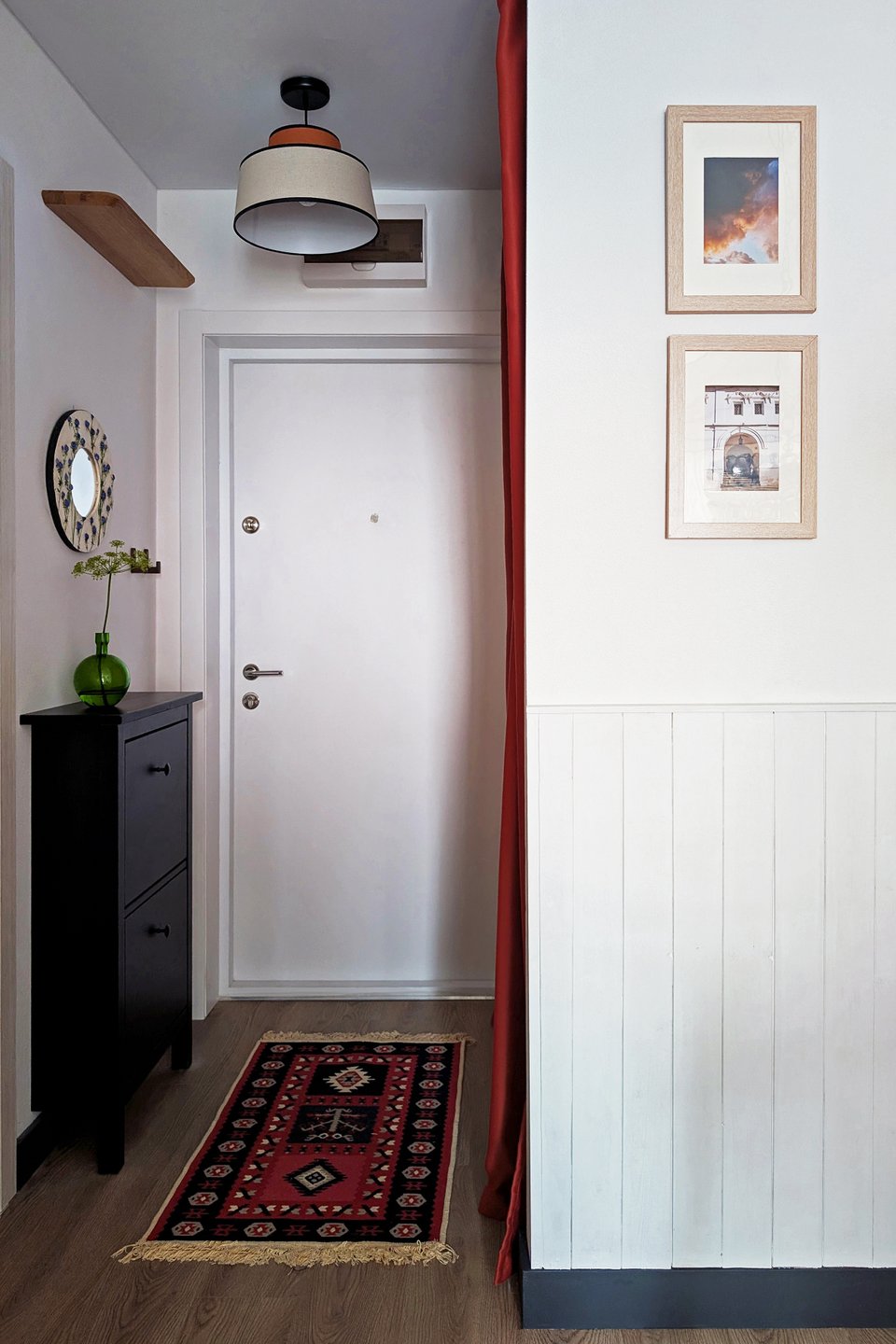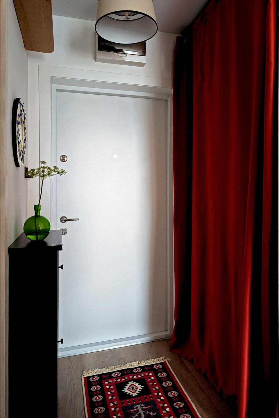 Застройщик запланировал в прихожей нишу под шкаф, но в связи с ограниченным бюджетом приняли решение использовать открытые системы хранения, спрятав их за плотным тяжелым текстилем. Здесь же установили стиральную машину, протянув вывод с кухни. Трубы закрыли вагонкой на кухне, чтобы не ремонтировать стены. Хранение готовое, открытое, система поделена на две части: одежда и бытовое хранение.