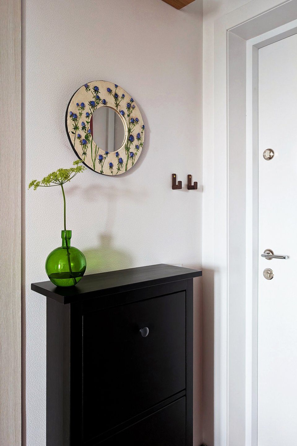 Квартиру приобрели с чистовой отделкой от застройщика: стены с белыми обоями под покраску, ламинат, пластиковые плинтусы, натяжные потолки, серая плитка в санузле. «Сложность представляли натяжные потолки, — рассказывает дизайнер. — Они сильно ограничивают в перевеске света. Выход был найден — в нужных местах сделали красивые отверстия для дополнительных крючков, куда можно перевесить свет на длинных проводах». Перепланировки в квартире не было, мокрые зоны остались на своих местах.