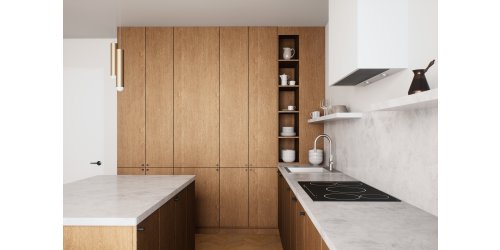 Бежевая кухня — удачный во всех отношениях вариант: она получается светлой, визуально просторной и к тому же не слишком маркой. Чтобы интерьер не выглядел скучным, добавьте в него несколько акцентов красного или винного цвета: шторы, мелкую бытовую технику, посуду. Внесет разнообразие и темное дерево: например, пол или фасады нижних шкафов.