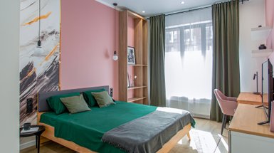 — Спальня получилась достаточно просторной, и это не только благодаря большому балконному проему. Здесь мы поиграли на контрастах: выбрали светлый оттенок краски на стенах, а в противовес ему — кровать насыщенного голубого цвета и шторы. В комнате также расположился большой встроенный шкаф в нише почти до потолка, а также нашлось место для небольшой рабочей зоны с ярким акцентом в виде стула.