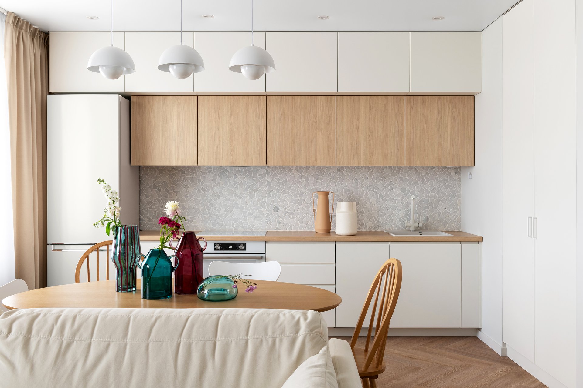 По просьбе заказчиков фасады гарнитура выполнены в двух оттенках: дерево и светлый беж. Фартук выложили из мозаики в натуральном камне.