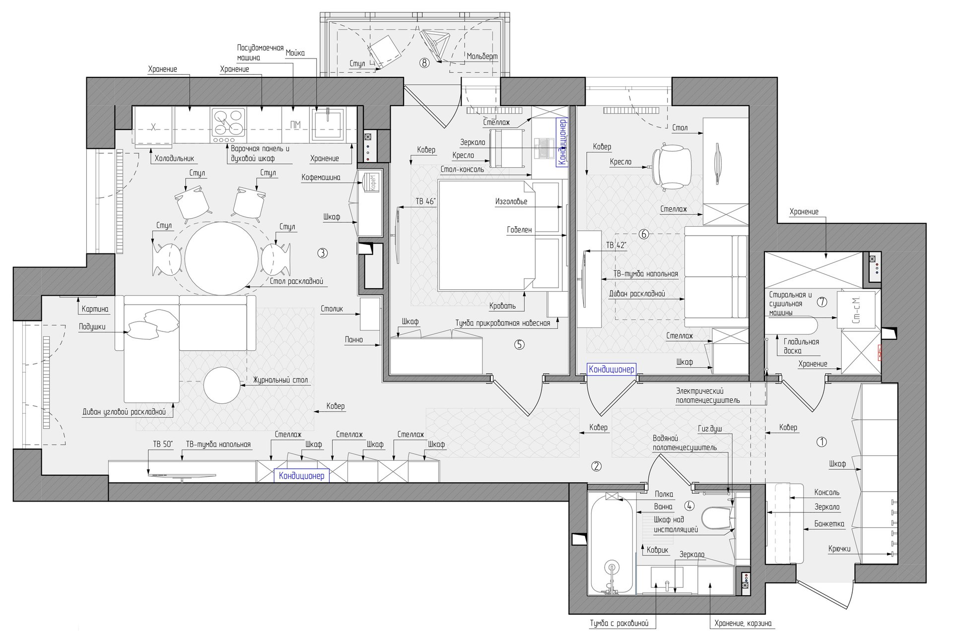 Обратите внимание: кондиционер спрятали в стеллаж (найдите фото в галерее выше), поэтому он не виден из прихожей.