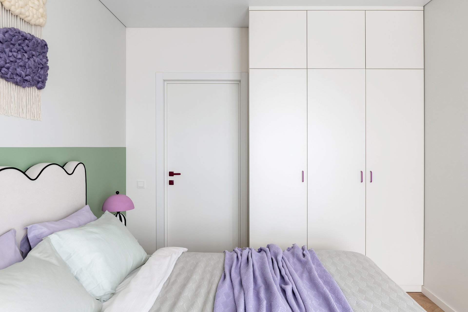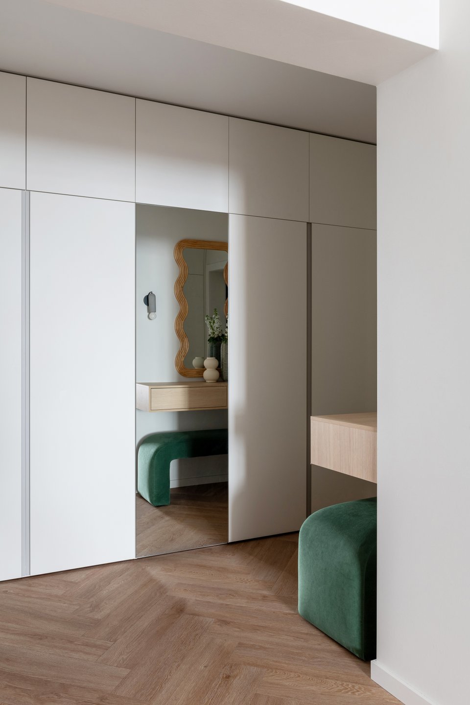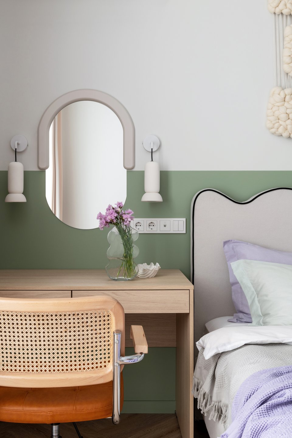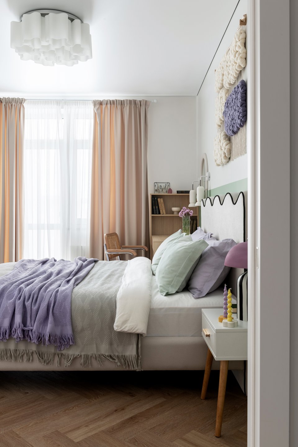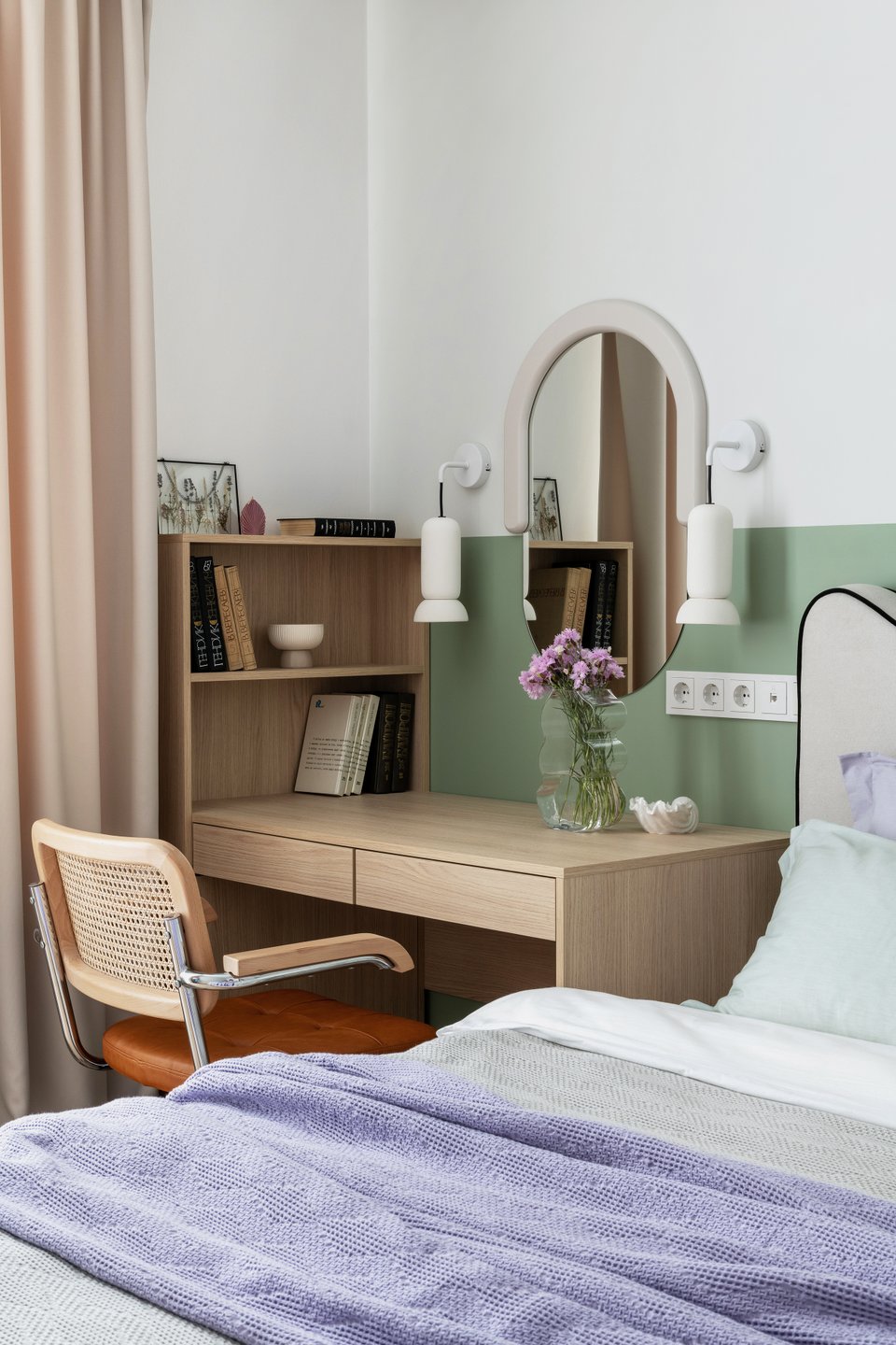 Рядом с кроватью организована зона для макияжа — небольшой стол с зеркалом и полками. Кресло Элисон от divan.ru вдохновлено скандинавскими мотивами интерьера. В спальне также располагается вместительный шкаф с цветными ручками.