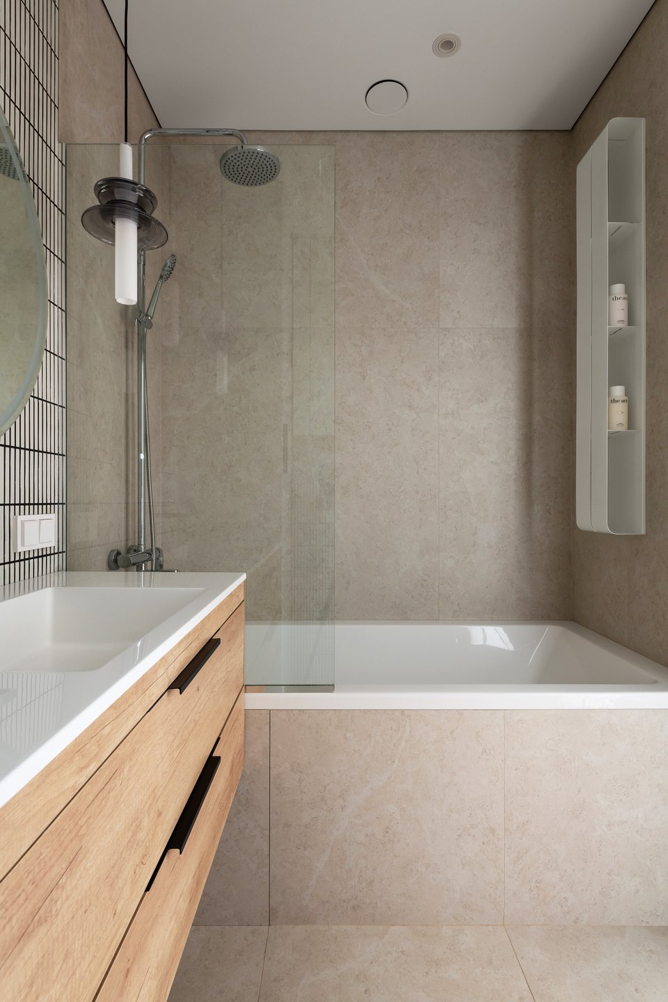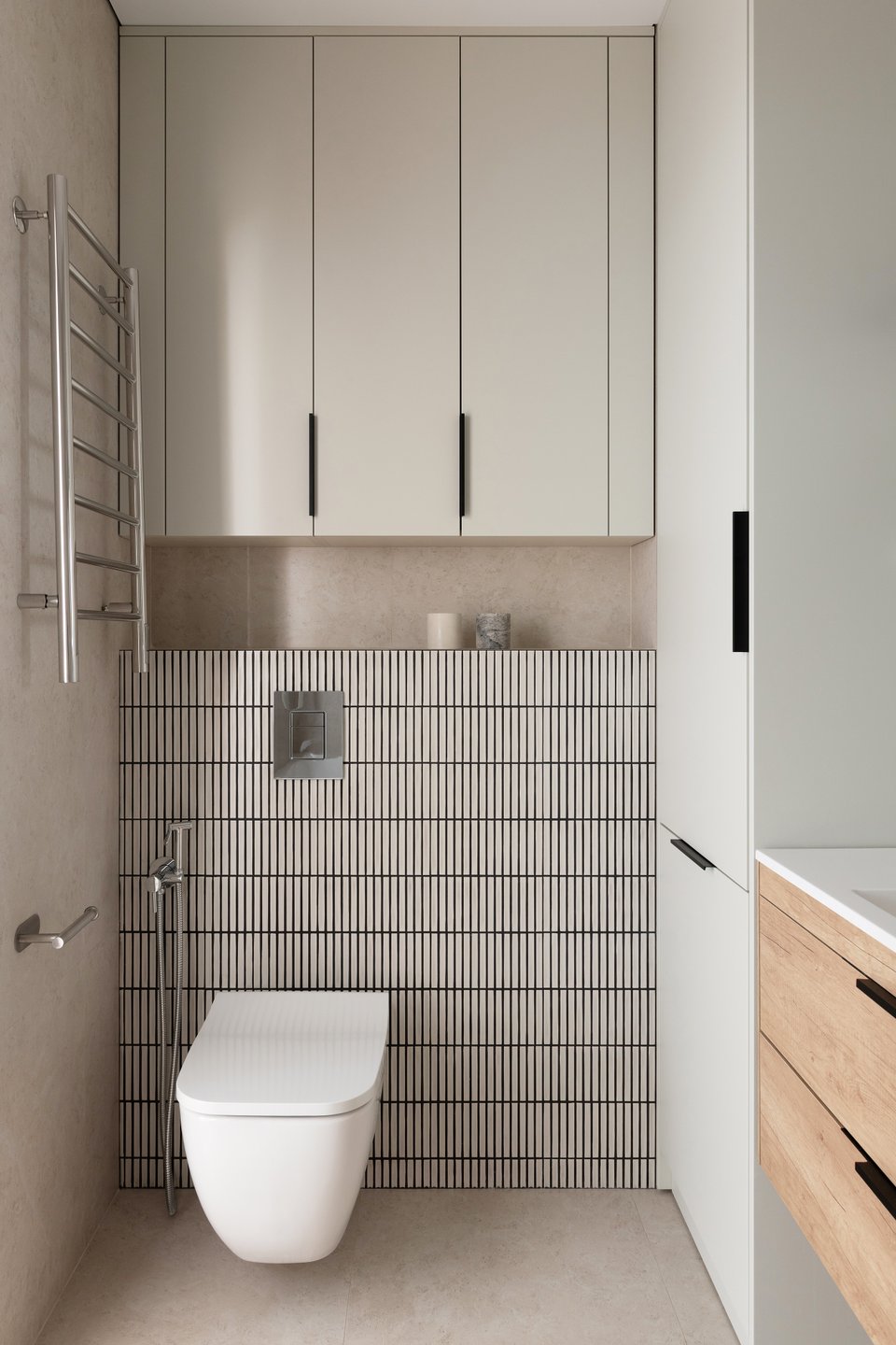 Санузел получился монохромный и лаконичный. Основной задачей было организовать множество мест для хранения и пространство для бельевой корзины, а также спрятать инженерию.