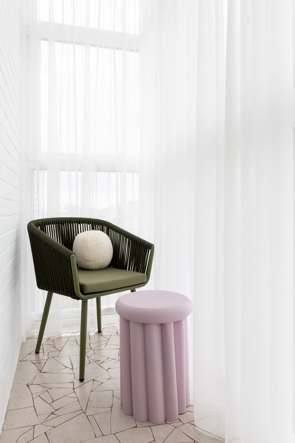 На балконе обустроили зону отдыха с креслом и столиком в нежном розовом оттенке.