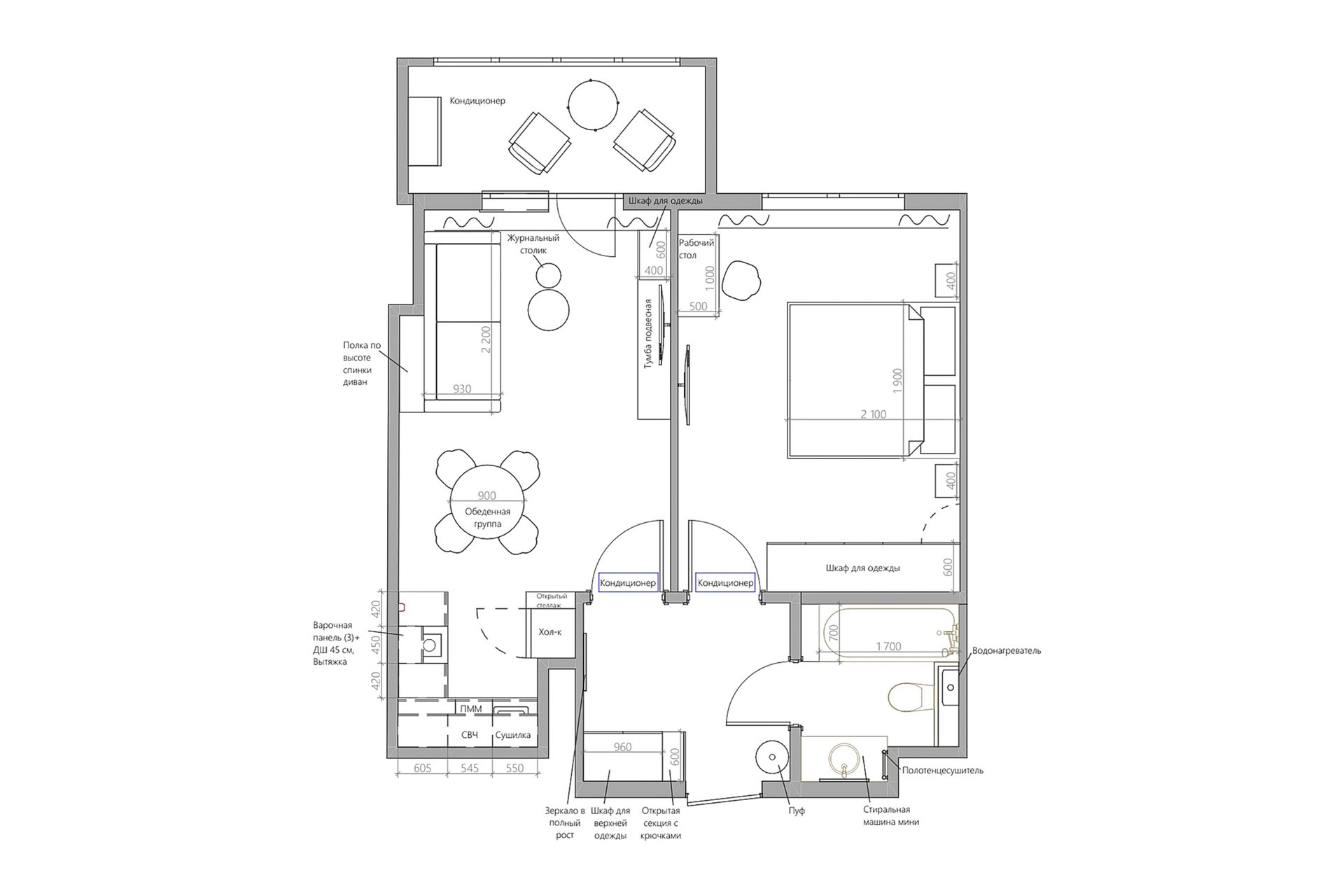- Предусмотреть четыре спальных места: кровать шириной 180 см в спальне и раскладной диван в кухне-гостиной