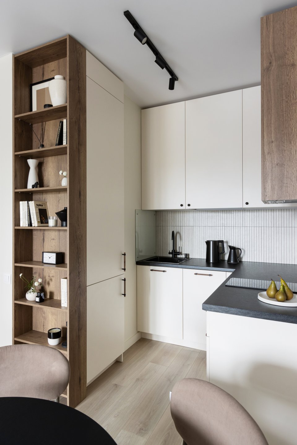 Гарнитур П-образной конфигурации встроили в нишу. Верхние модули расположены по одной стене. Вторая сторона кухни оформлена лаконично — здесь находится только вытяжка. Чтобы торец глубокого шкафа с холодильником не утяжелял интерьер, его обыграли стеллажом для декора.