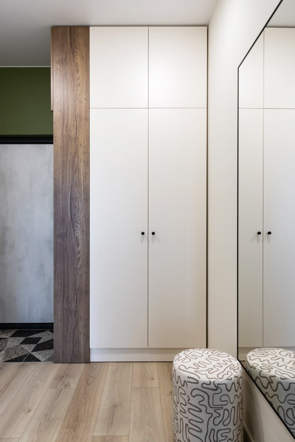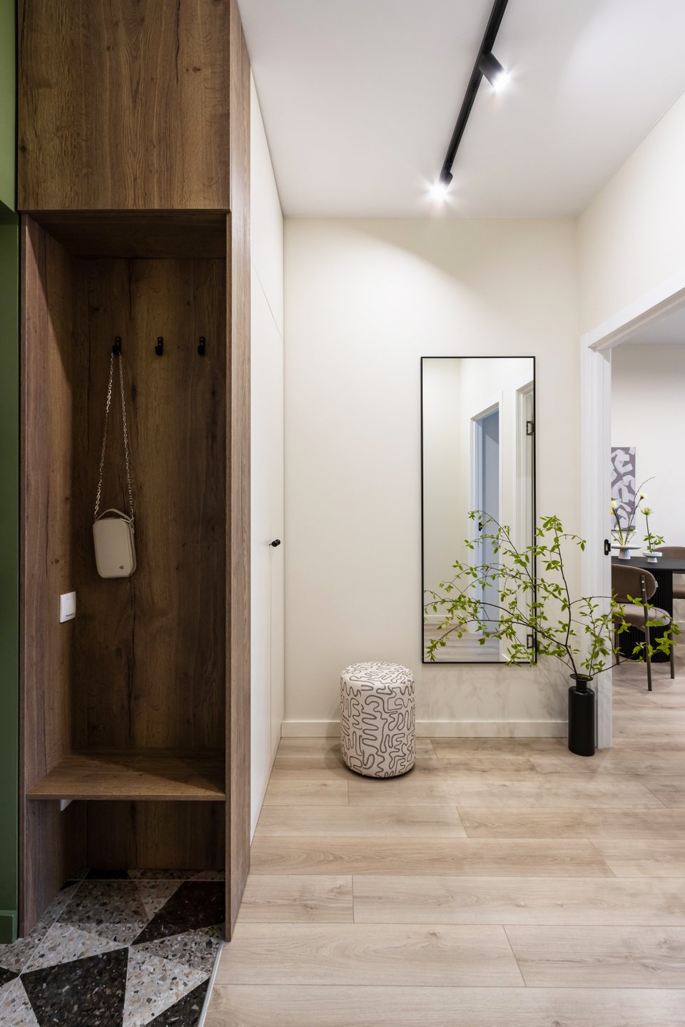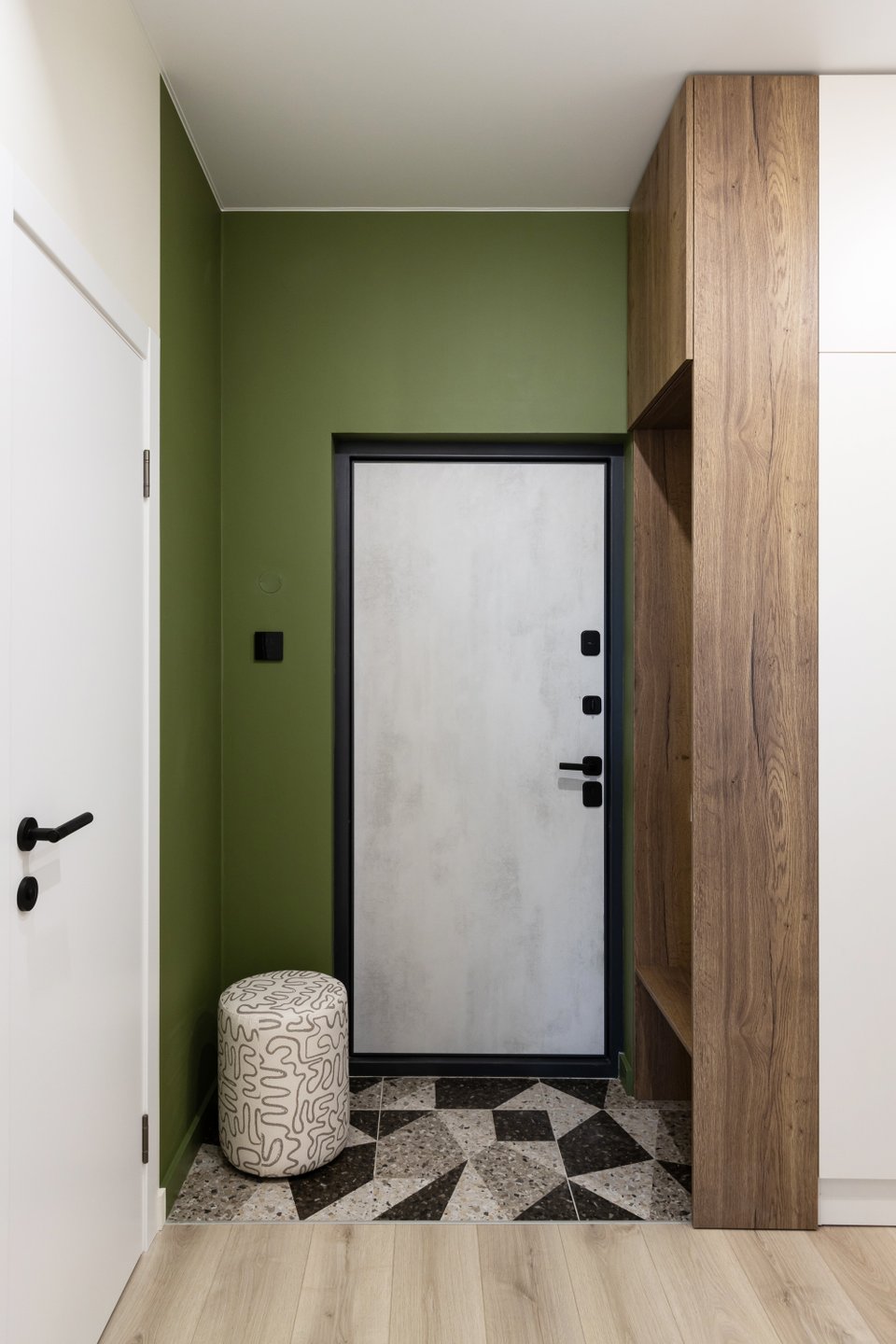 Фрагмент стены у входной двери окрашен в травяной оттенок, который перекликается с цветом дивана в гостиной. На полу использована акцентная плитка, напоминающая тротуарную плитку на территории жилого комплекса.