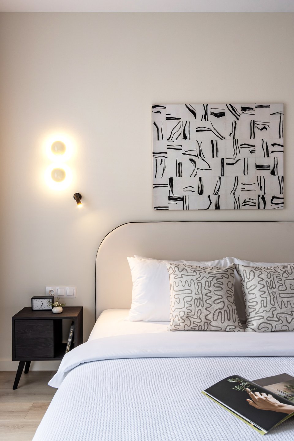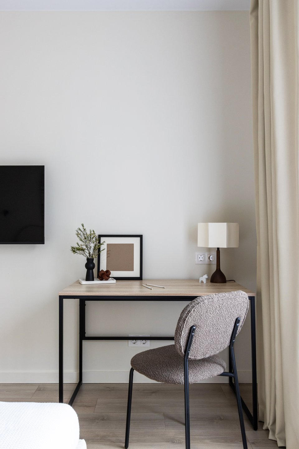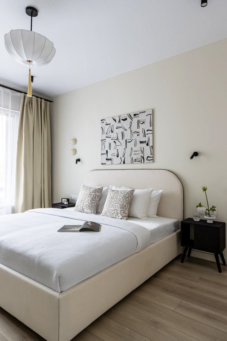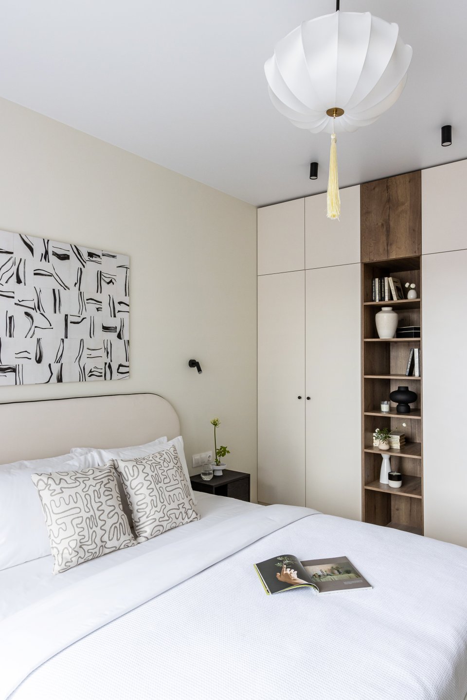 Главным элементом спальни стала кровать — ее лаконичный силуэт подчеркнут черным кантом, который перекликается с другими черными деталями интерьера. Шкаф совмещает закрытое хранение и открытый стеллаж для книг и декора. Освещение также многоуровневое: точечный свет, тканевая люстра с кисточкой, настольная лампа на рабочем столе и светильники для чтения по обе стороны кровати.