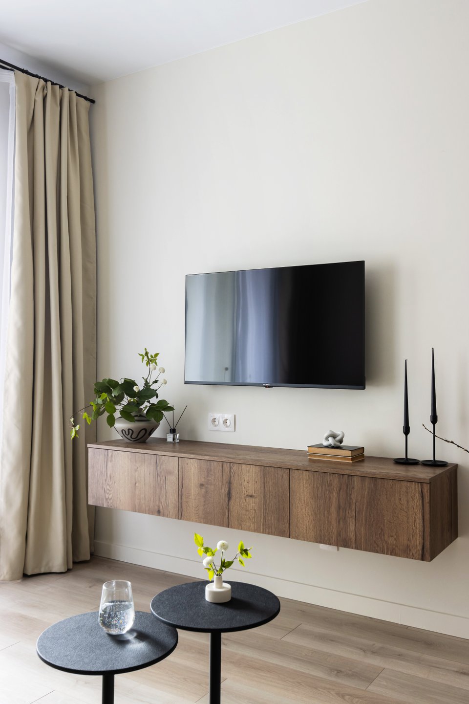 Обратите внимание: выступ стены в гостиной решили не маскировать, а задействовать как часть композиции — так за диваном появилась узкая полка. Она служит местом для декора, в ней предусмотрены розетки для зарядки телефона и подключения настенного светильника. Конструкция полая, поэтому при необходимости диван можно отодвинуть и использовать пространство внутри как дополнительное место хранения.