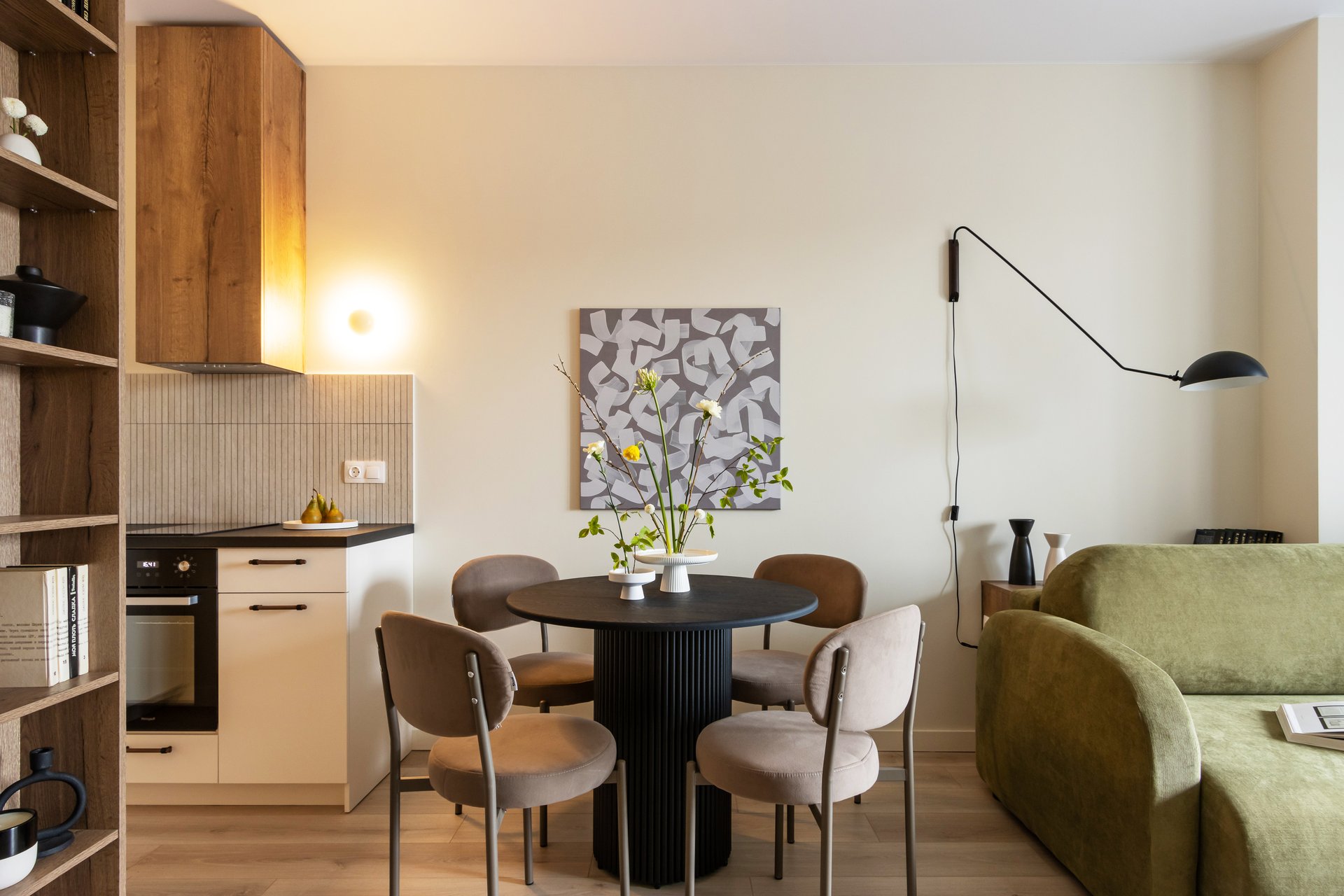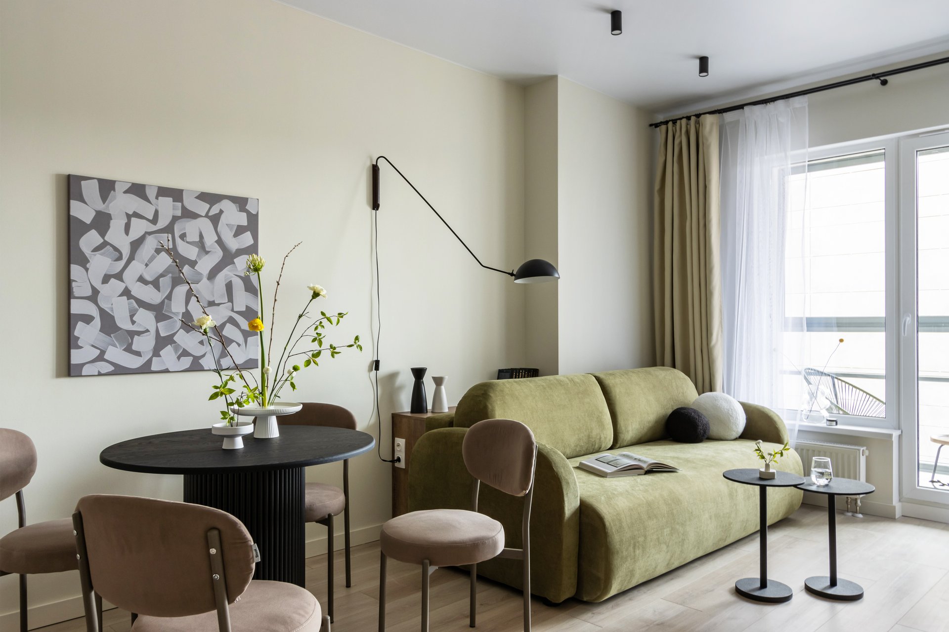 Застройщик сдавал квартиру с предчистовой отделкой («вайт бокс»). Перепланировка не потребовалась, все перегородки остались на своих местах. Кухня в квартире объединена с гостиной, есть изолированная спальня, совмещенный санузел, прихожая и балкон. Сильные стороны объекта — просторные комнаты и высота потолков 2,75 метра, благодаря чему квартира воспринимается светлой и воздушной.