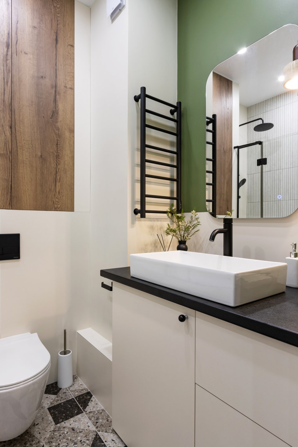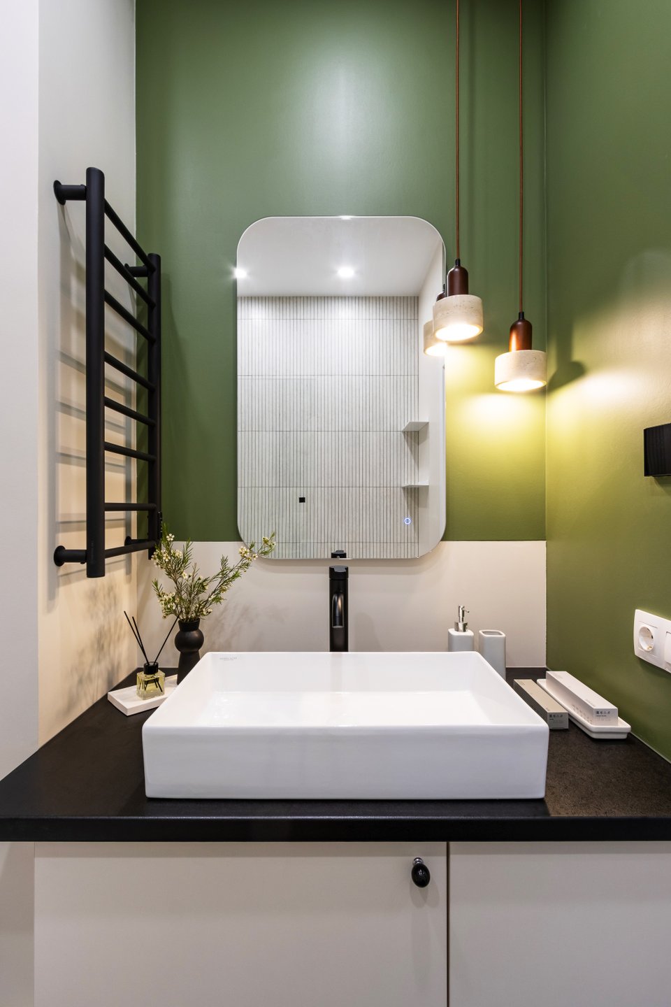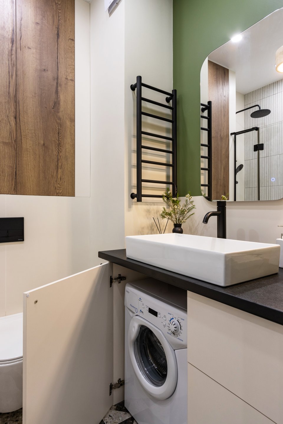 Отделка санузла — комбинация плитки и окрашенных поверхностей (в зонах, не контактирующих напрямую с водой). Под раковиной разместили стиральную машину и выдвижные ящики для хранения.