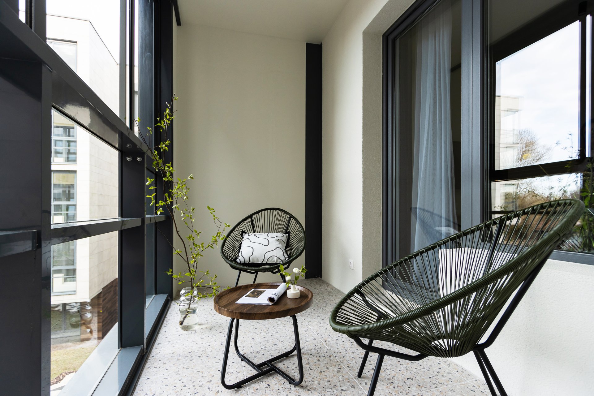 Из кухни-гостиной есть выход на балкон. Его превратили в зону отдыха с уличными креслами и журнальным столиком.