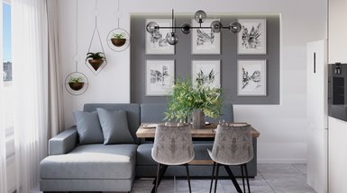Выступающая колонна в гостиной — несущая конструкция. Убрать ее было нельзя, зато получилось использовать для установки вертикального радиатора. Колонну оклеили однотонными обоями — в противном случае радиатор наложился бы на рисунок. Акценты сделали только в нишах. Обои подобрали из той же коллекции, что и однотонные.