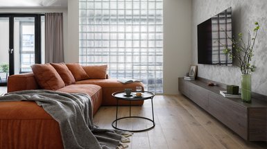 Владельцы этой квартиры не боятся экспериментов. Дизайнер Анастасия Заркуа решила наполнить проект цветом — в качестве доминирующего выбрала терракотовый, разбавила его изумрудным, черным и желтым. Цвет не только сделал интерьер ярким, но и скрыл недостатки планировки.